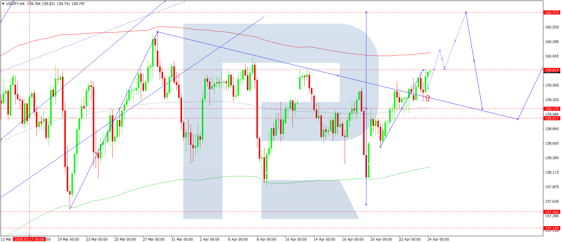On the H4 chart of the USDJPY pair, the market found support at 159.50. Today, 24 April 2026, a consolidation range is developing below this level. An upward wave to 160.15 is possible. Subsequently, a decline to 159.80 is expected, followed by growth to 160.77.