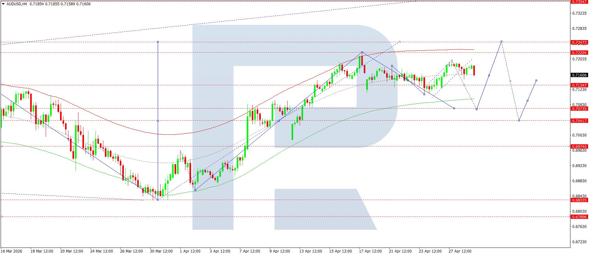 On the H4 chart of the AUDUSD pair, the market formed a consolidation range around 0.7164. Today, 29 April 2026, a downward breakout would open the potential for a continued downward movement towards 0.7073, with prospects for further decline to 0.7050.