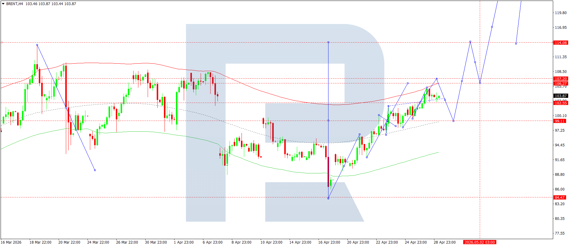 On the H4 chart of Brent crude oil, the market completed a growth structure to 105.45. Today, 28 April 2026, a new consolidation range could form below this level. An upward breakout from the range would pave the way for growth to 106.26, with prospects for continuation of the trend to 107.20, a local target. Conversely, a downward breakout could trigger another corrective move towards 99.11. Subsequently, growth to 114.00 is expected.