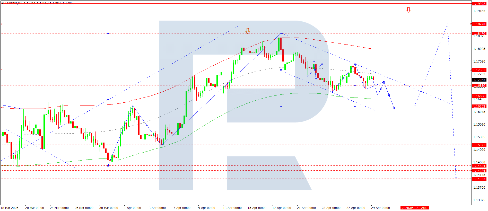 On the H4 chart of the EURUSD pair, the market completed a downward wave to 1.1678 and a correction to 1.1717. Today, 29 April 2026, a downward wave structure is forming towards 1.1655. Subsequently, an upward wave could start, aiming for 1.1688. Then a decline to 1.1625 is expected.
