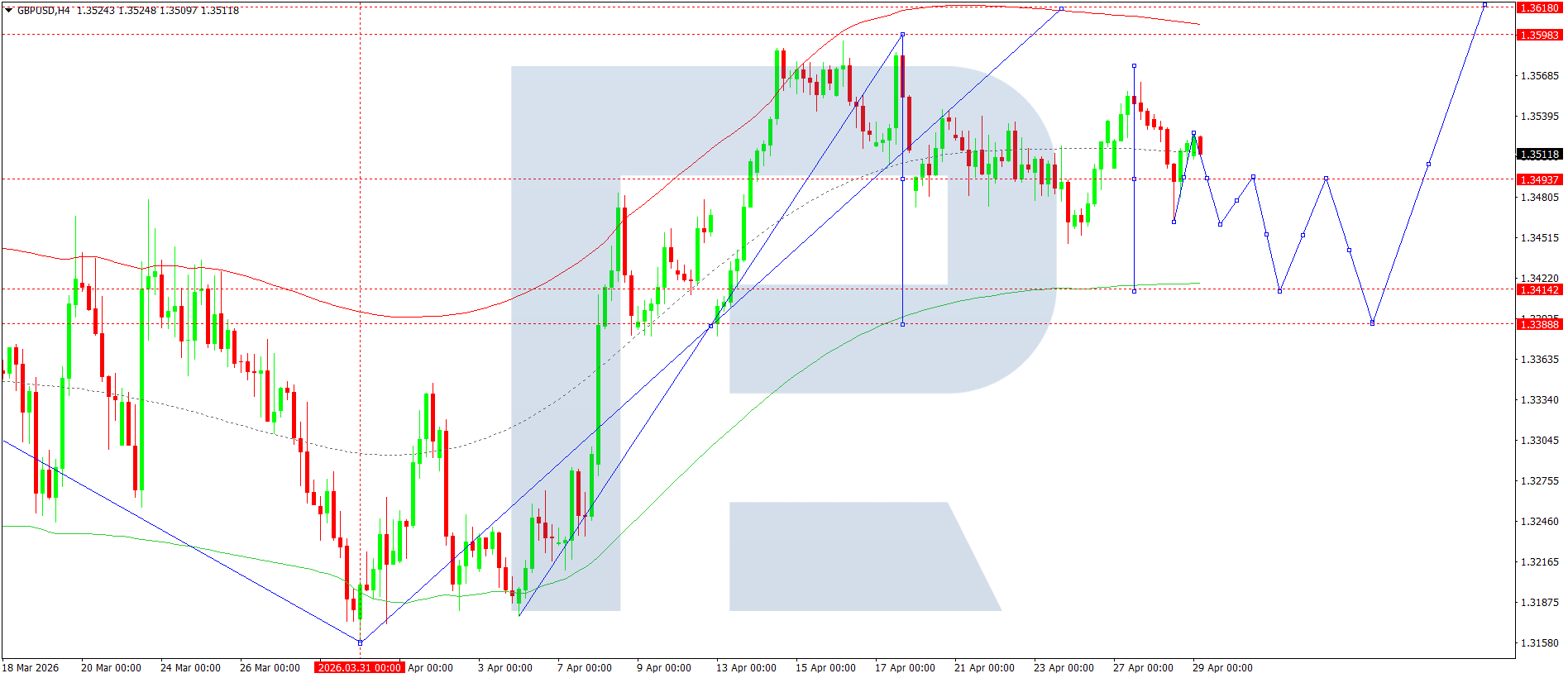 On the H4 chart of the GBPUSD pair, the market continues to develop a consolidation range around 1.3494. At the moment, the range expanded upwards to 1.3525. Today, 29 April 2026, the range is expected to expand downwards to 1.3460. A breakout below this level would open the way towards 1.3415 and possibly further to 1.3388.