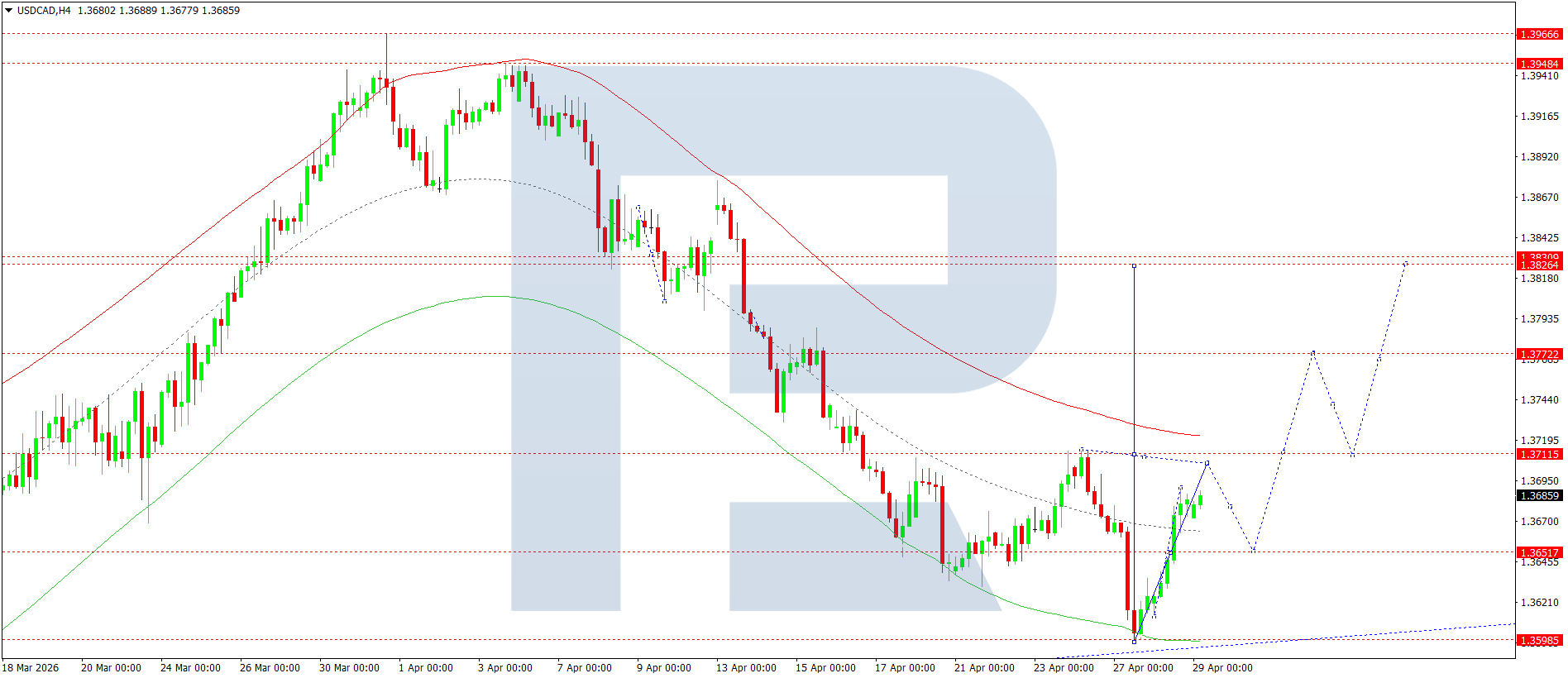 On the H4 chart of the USDCAD pair, the market completed a downward structure to 1.3599. Today, 29 April 2026, a consolidation range has formed above 1.3656. An upward breakout would open the door to a wave towards 1.3705. Subsequently, the price is expected to dip to 1.3666 before rising to 1.3772 and possibly further to 1.3825.