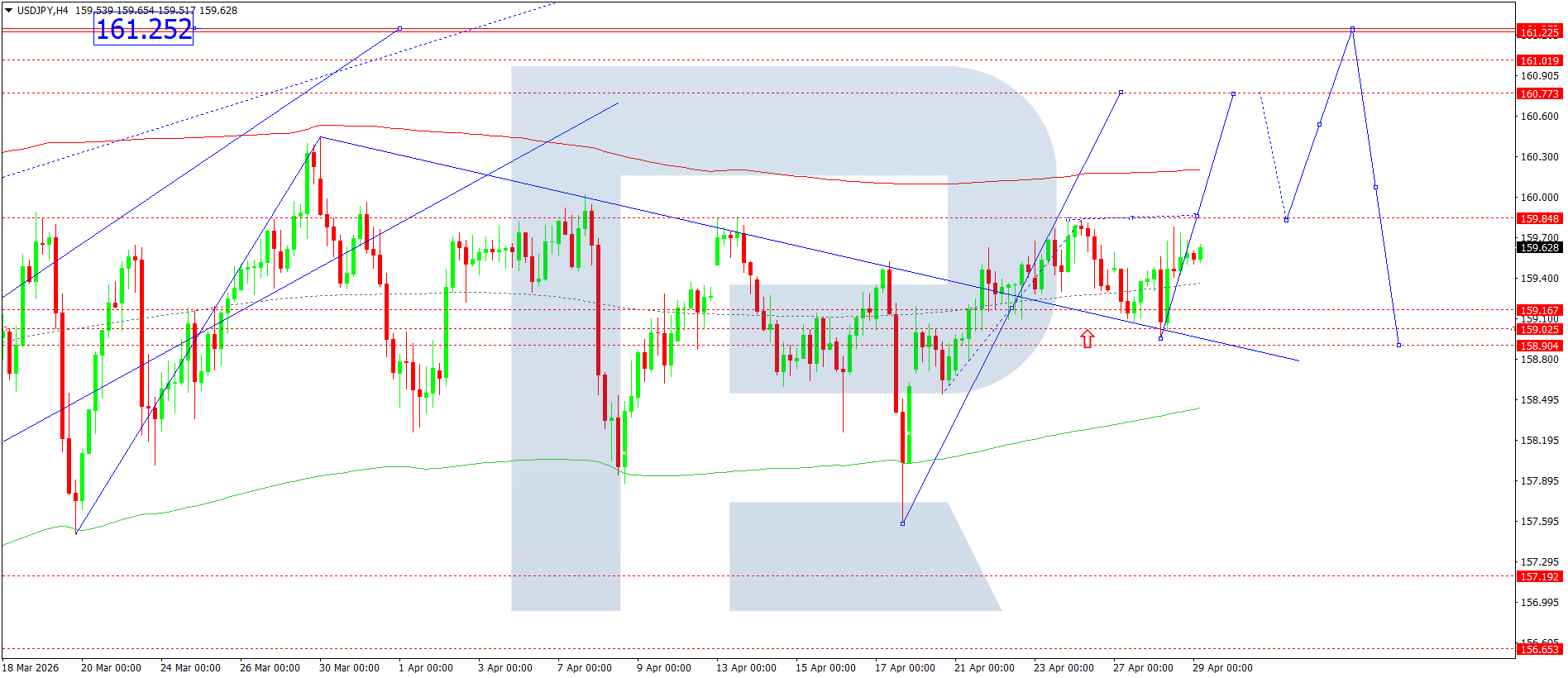 On the H4 chart of the USDJPY pair, the market completed a correction, reaching 158.95. Today, 29 April 2026, a consolidation range is developing around 159.50. An upward wave towards 159.90 is likely. Subsequently, the price is expected to break above this level and climb to 160.30 and possibly further to 160.77.