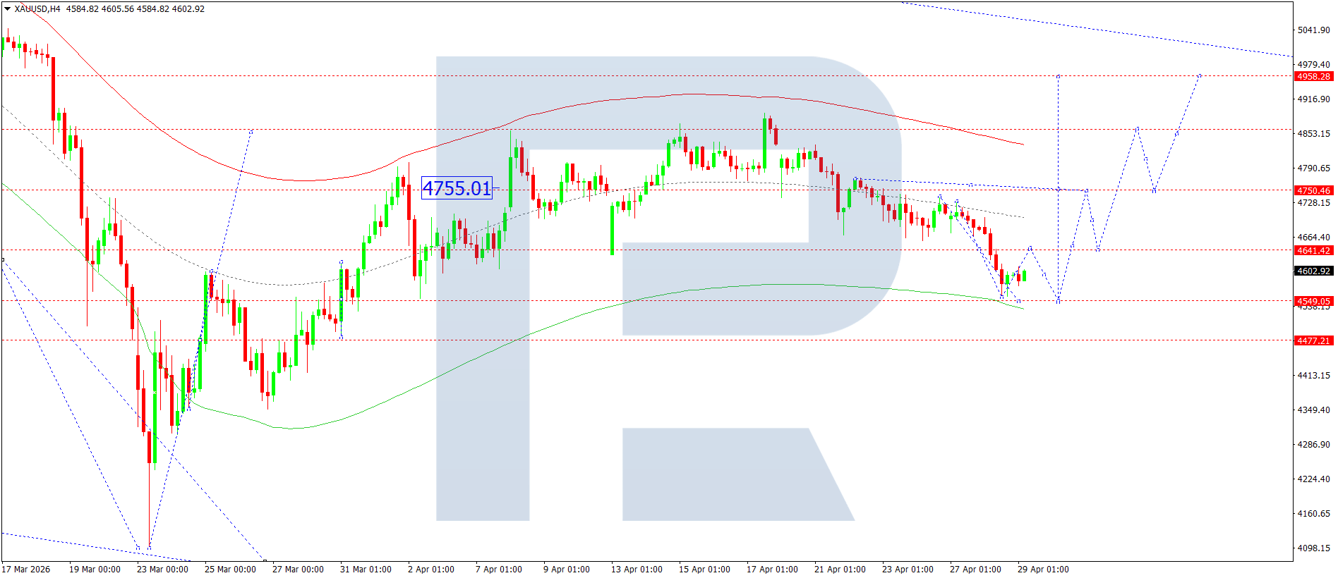On the H4 chart of XAUUSD, the market is forming a consolidation range around 4,626. Today, 29 April 2026, a downward move towards 4,549 is expected, with prices testing this level from above. Subsequently, growth to 4,750 is expected.
