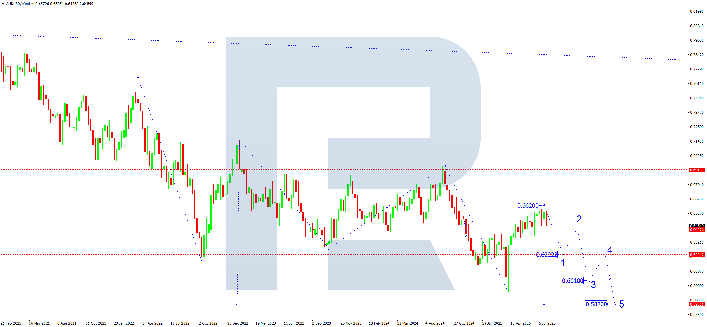 On the weekly chart, the AUDUSD pair completed a corrective move near the 0.6620 level and began to form a new downward wave. The current structure indicates the development of a final fifth wave of decline within a medium-term trend.