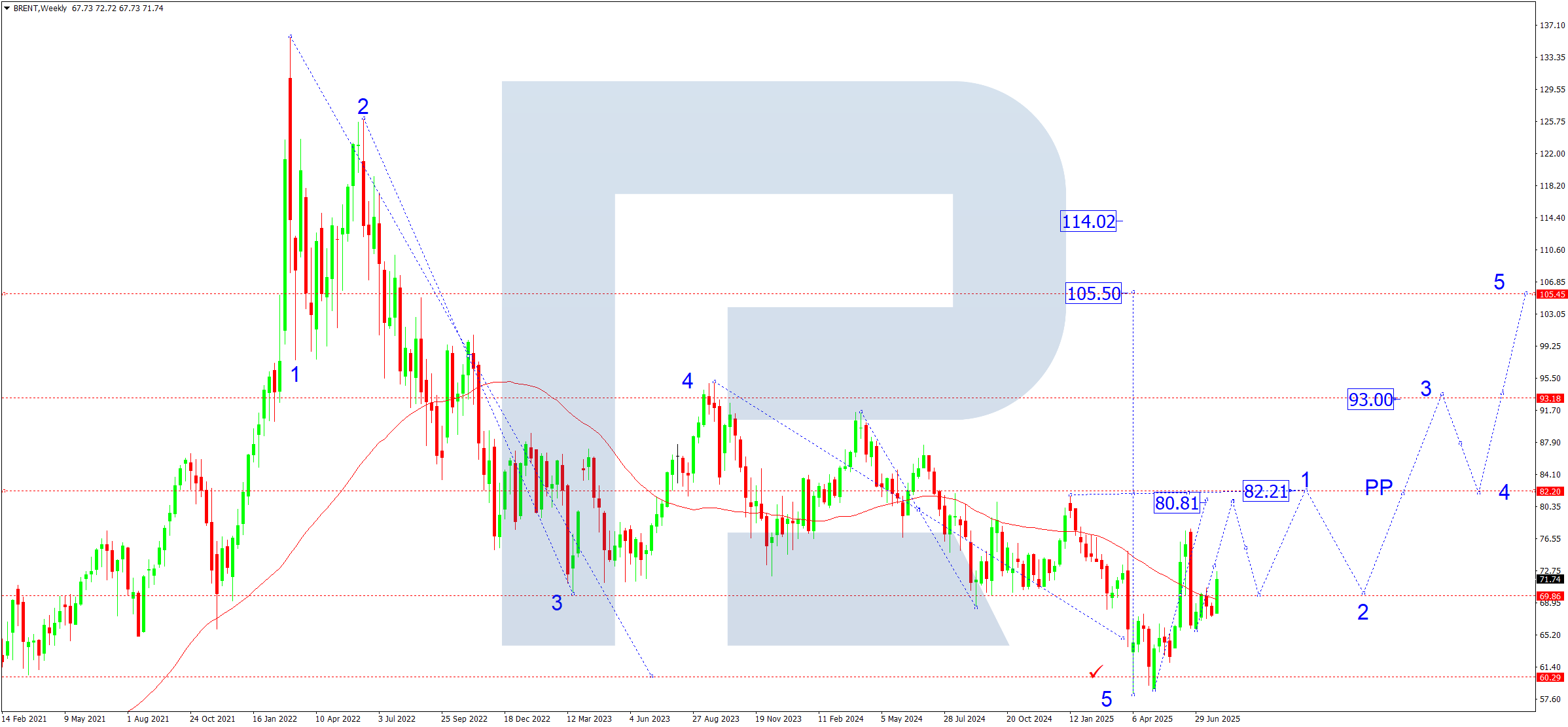 On the weekly chart, Brent crude is forming a stable upward structure. After stabilising in the 70.00 zone, the market is heading towards the first target at 82.20; a breakout of this level would open the path to 93.00 (second target). The upward impulse is expected to continue within the fifth wave of growth, with a target at 105.50.