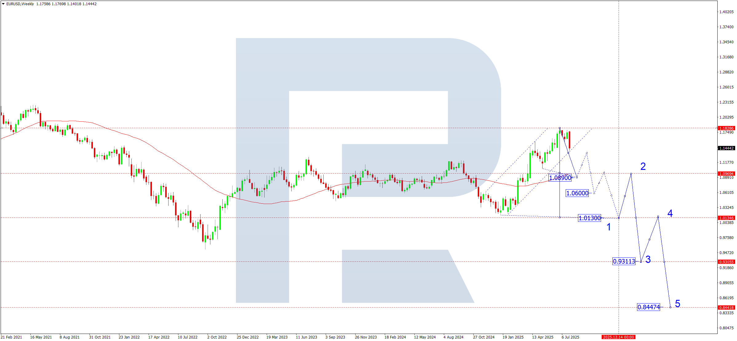 On the weekly chart, the EURUSD pair continues its steady downtrend that started in late June 2025. Breaking through the 1.1555 level has opened the path to a medium-term target corresponding to the width of the previous consolidation range.