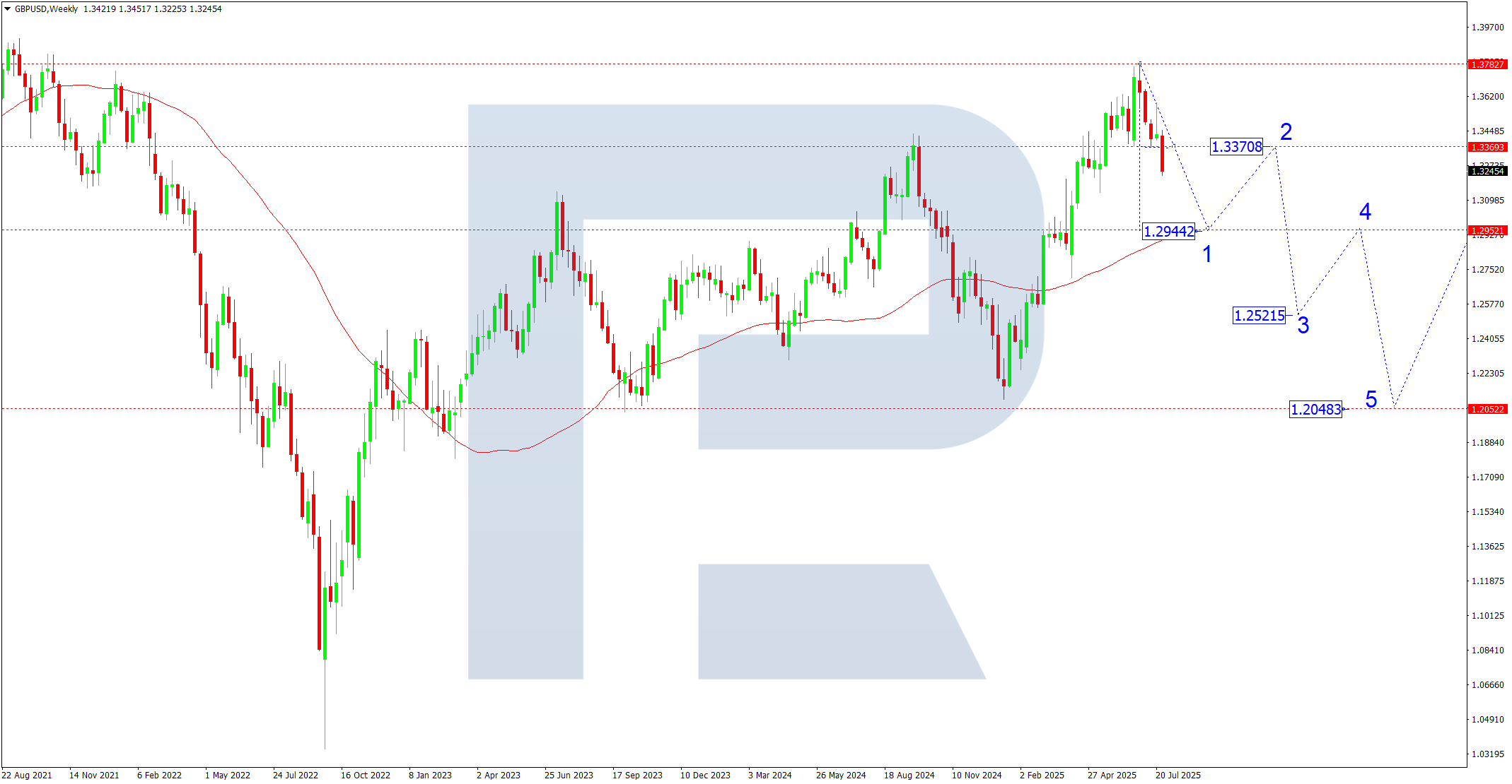 On the weekly chart, the GBPUSD pair has completed a growth wave that began in January 2025 from the 1.2100 level. A consolidation range has formed around 1.3790, structurally resembling a Diamond reversal pattern. The breakout of the 1.3370 level triggered a downward phase with the first target in the 1.2944 zone, where the 50-week Moving Average passes. Local support and a possible rebound within a correction back to 1.3370 (testing from below) are expected here.