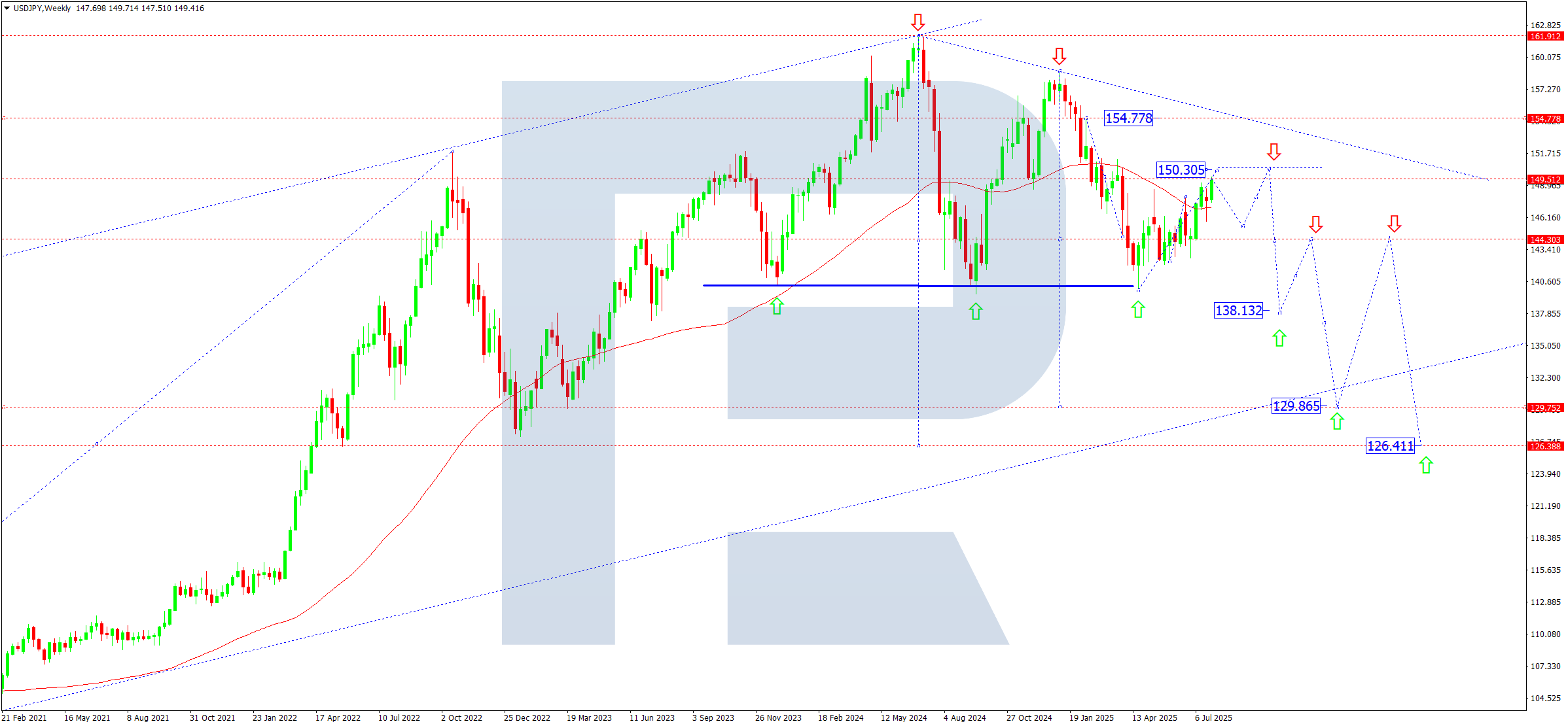 The USDJPY pair is trading within a Symmetrical Triangle on the weekly chart, which began to form after hitting an all-time high of 161.91. Since January 2025, a downward structure has emerged, with an intermediate target around 129.90 – a level of interest for medium-term sellers.