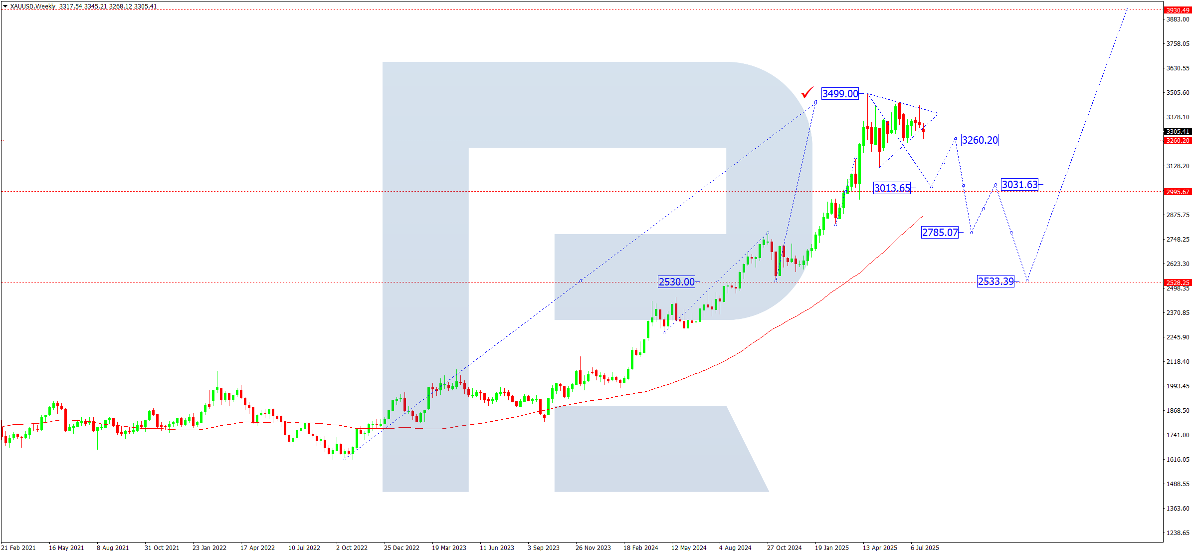 On the weekly chart, a Triangle pattern has formed near the historical high (3,499), indicating a consolidation phase following an extended growth impulse. The 3,120-3,450 range has become a balance zone between supply and demand.