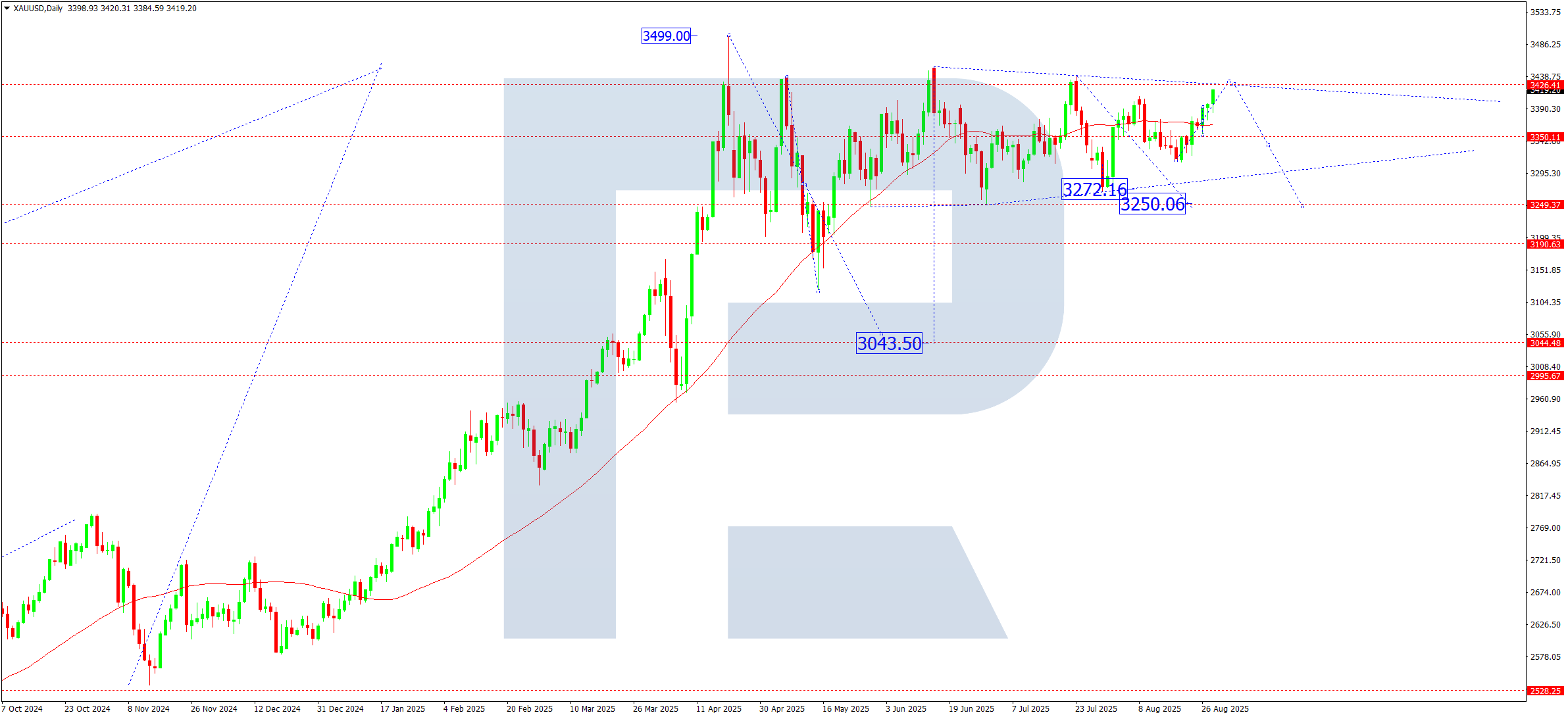 On the daily chart, gold found support at 3,373, where the SMA50 also lies. Next week, the upward wave is expected to continue towards the upper boundary of the consolidation range at 3,433. A breakout higher would extend growth to 3,474. Currently, the structure forms a symmetrical triangle top, often a signal of an upcoming major correction.