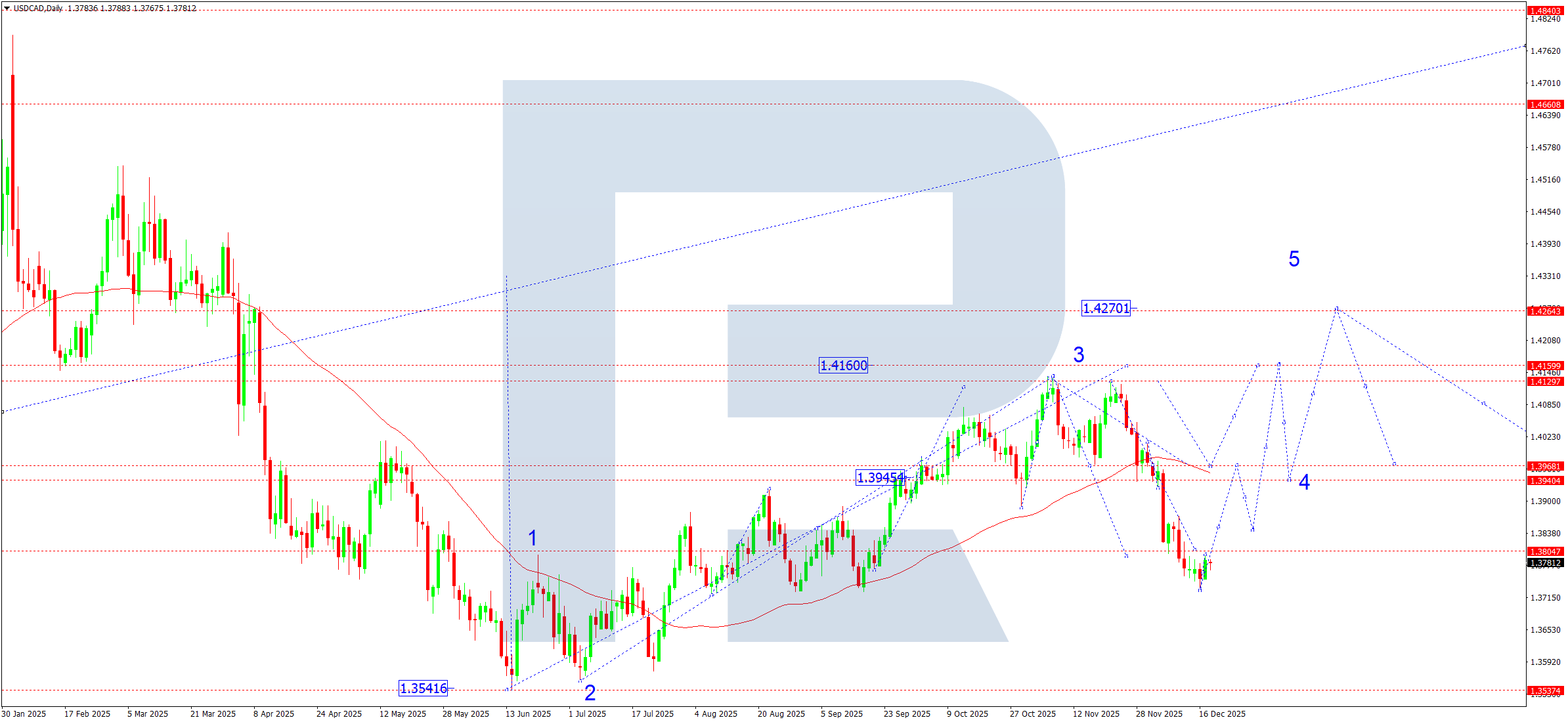 At present, price trades near the 1.3805 area, building a base for a potential upwards reversal. Structurally, the current decline fits into a corrective phase within the development of the fourth growth wave.