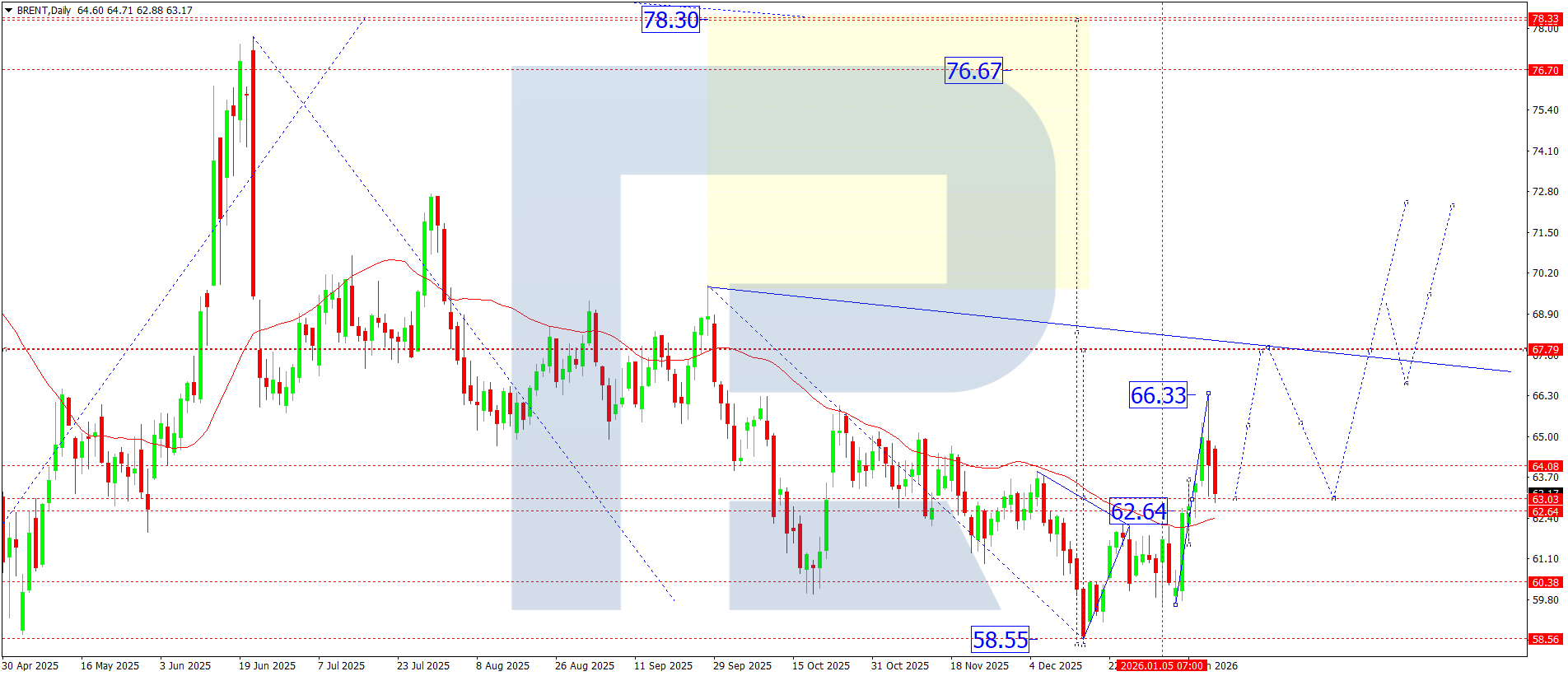 Bearish (alternative) scenario: if the corrective dynamics strengthen, the market may decline towards 60.66, after which it may look for an upward reversal point.