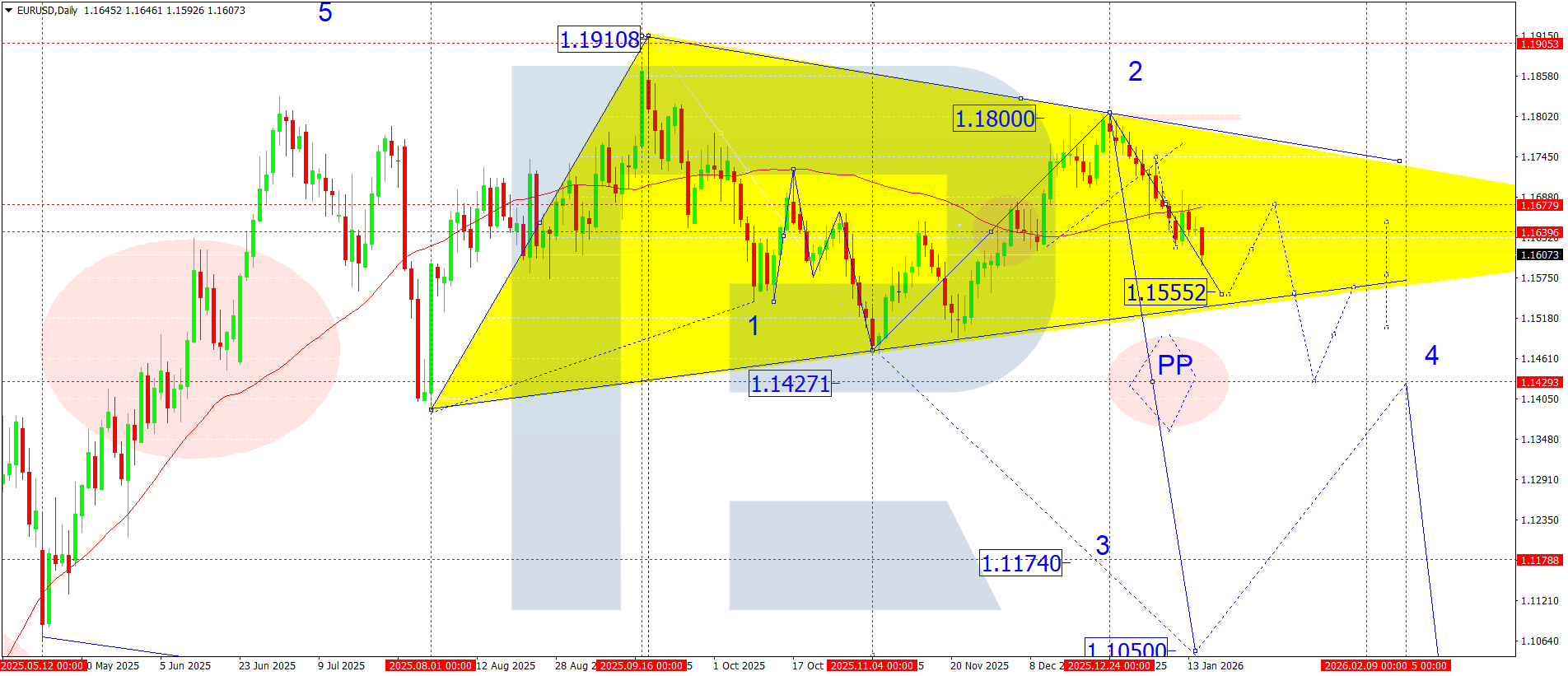 Bullish (alternative, unlikely) scenario: if the market breaks above 1.1630 amid rising volumes, a correction may develop with the target at 1.1680.