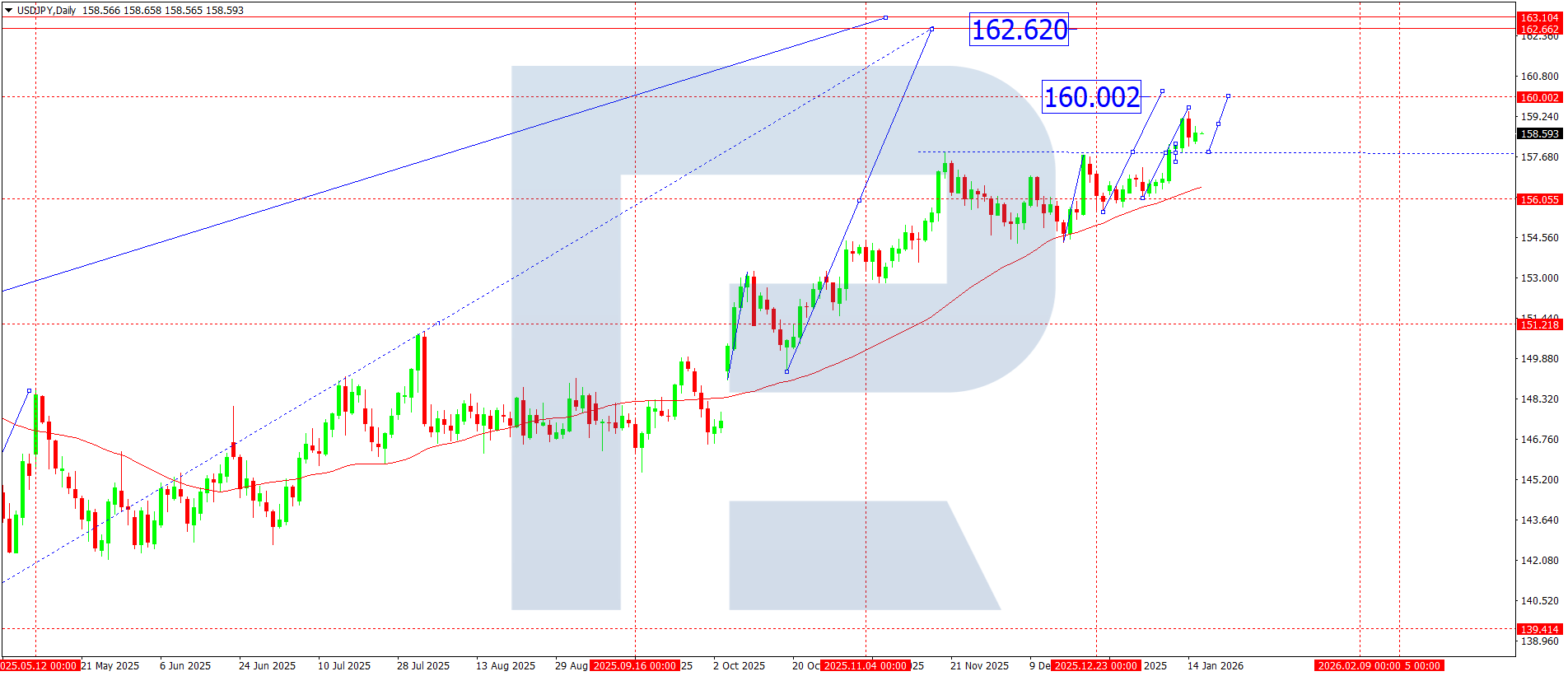 Over the coming week, the fifth growth wave is expected to extend, with the primary target at 160.00. If momentum develops, the wave may extend further towards 162.62.