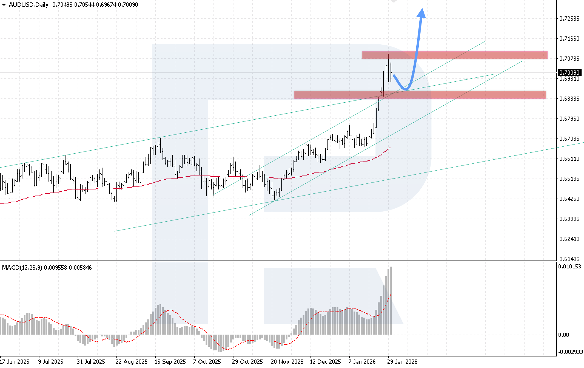 Bullish scenario (baseline): holding above 0.6900 will enable further growth towards 0.7265, which is especially relevant amid rising expectations of an RBA rate hike.