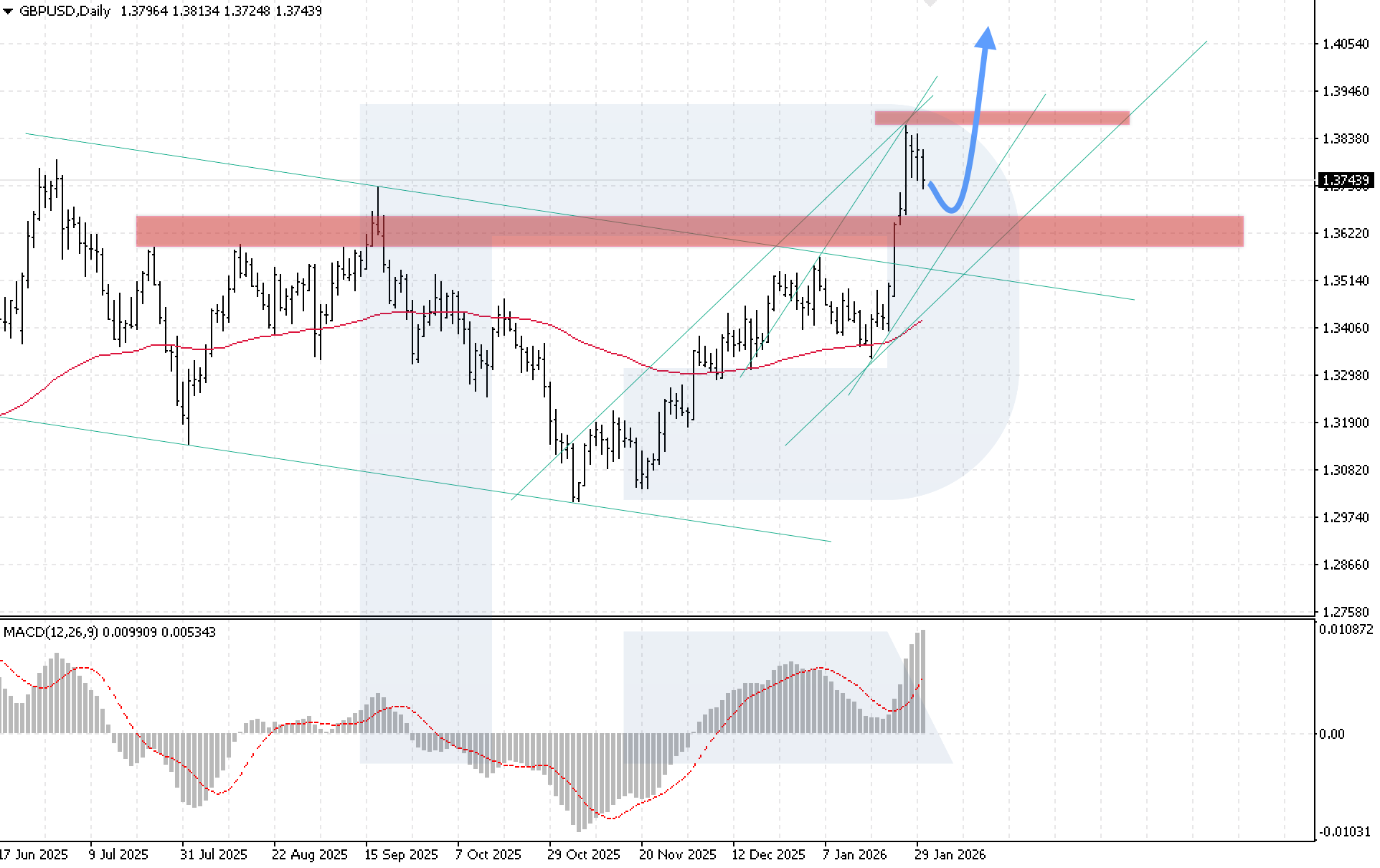An alternative scenario becomes relevant if the 1.3625 resistance level is broken. This would signal a return to the bullish channel and could push the rate higher towards 1.3705.