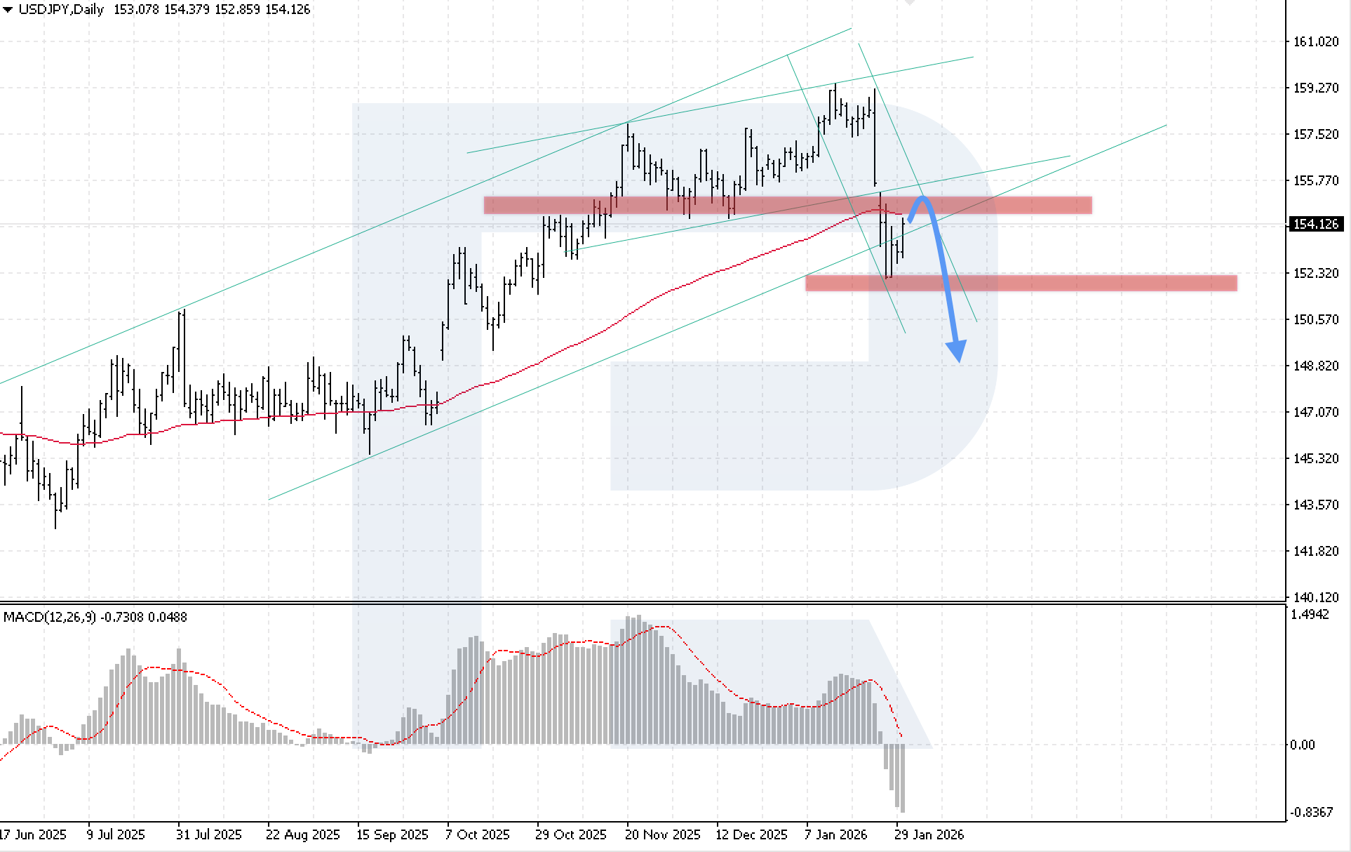 Bearish scenario (baseline): a rebound from the 154.75 resistance level will open the door for bearish momentum after the current correction, with a target at 148.85.