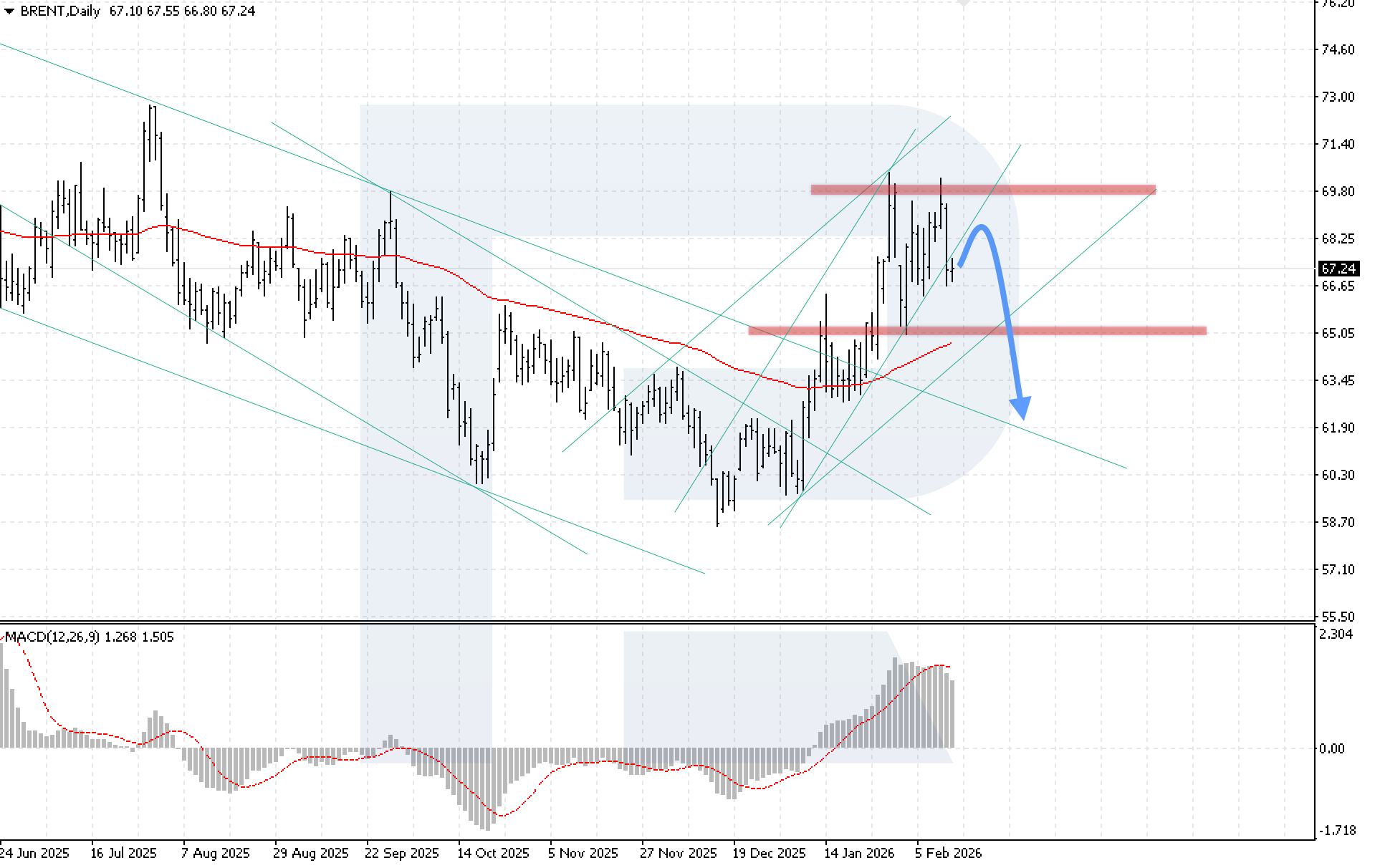 The bullish scenario in the Brent outlook will be activated if the resistance level is broken, with prices consolidating above 69.85 USD. This would confirm a breakout above the upper boundary of the reversal pattern and open the door for continued growth towards 75.05 USD.