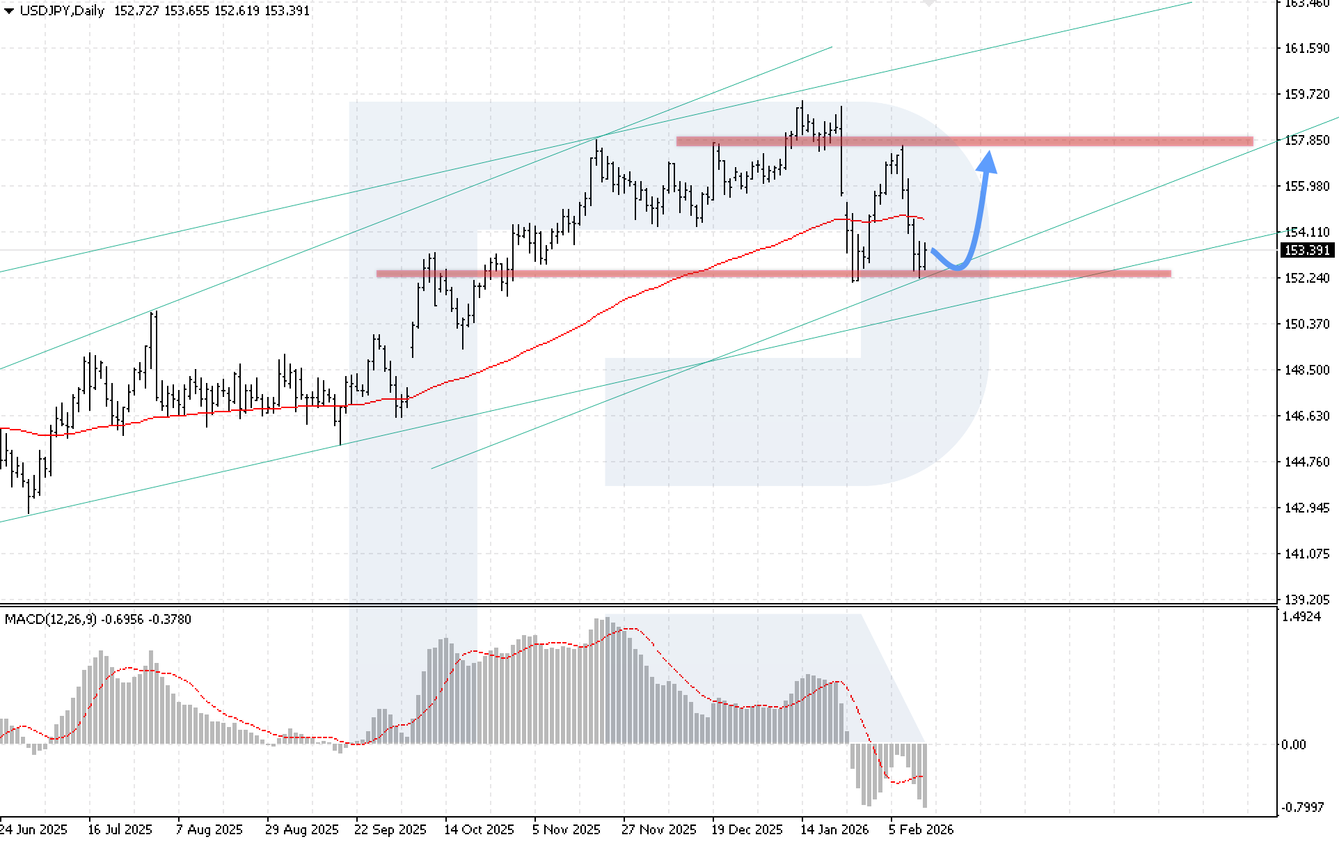 The USDJPY pair fell throughout last week and reached the key support level at 152.25. Pressure increased as the Japanese yen strengthened. Additional support for the yen came from remarks by Japan’s Prime Minister Sanae Takaichi. She outlined a course towards expanding fiscal policy with a focus on stimulating economic growth without excessive increases in the debt burden. This approach increased investor confidence in Japan’s economic outlook and supported the national currency.