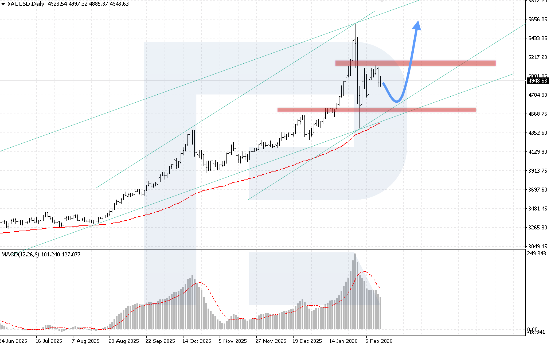MACD confirms the correction phase. The histogram continues to decline after a brief pause, reflecting slowing momentum and pointing to continued consolidation. A key condition for the bullish scenario is consolidation above 5,125 USD. A breakout of this level would confirm the upper boundary of the Double Bottom reversal pattern and open the potential for further growth within the pattern.