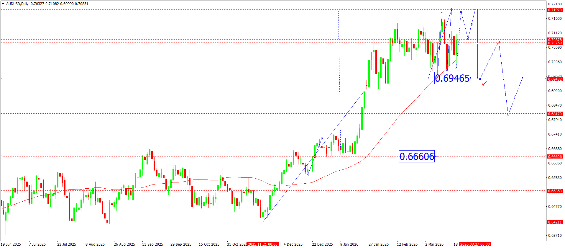 The 0.7081 area acts as the nearest resistance within the current range. Several attempts to consolidate above this zone have so far failed to lead to a sustainable continuation of the upmove. This indicates the presence of sellers in the upper part of the range.