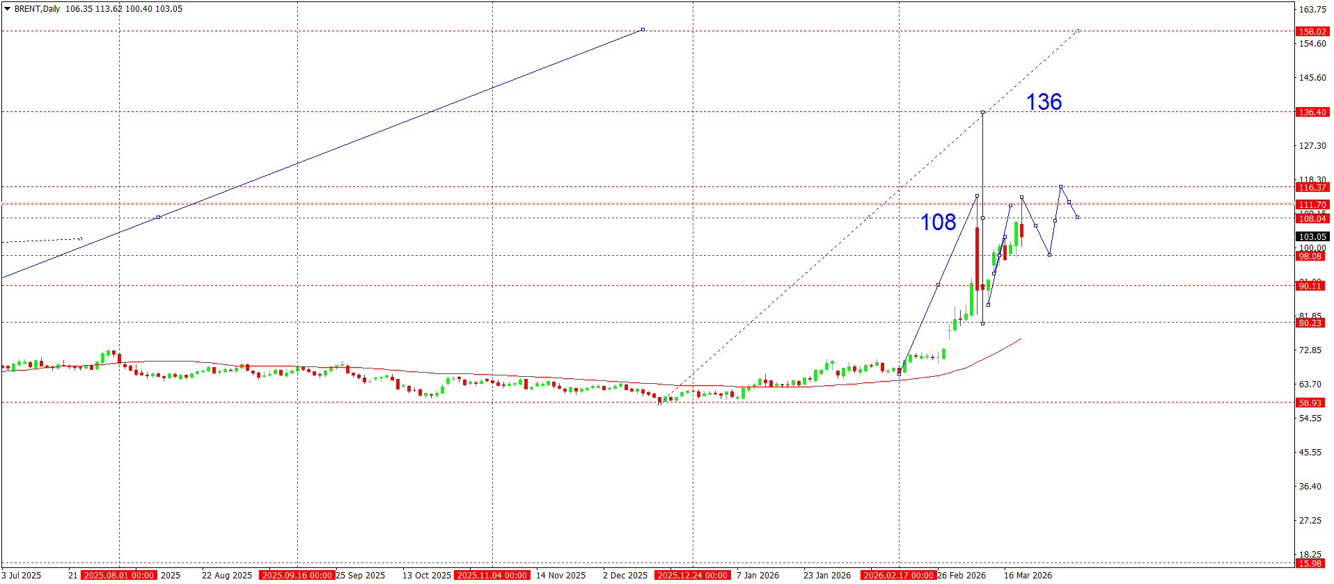 From a technical perspective, the daily Brent chart continues to show a firm uptrend after the powerful impulsive growth that began in mid-February. Price confidently broke above the long-term consolidation area and formed a strong impulsive wave that took the market from around 70 dollars to above 100.