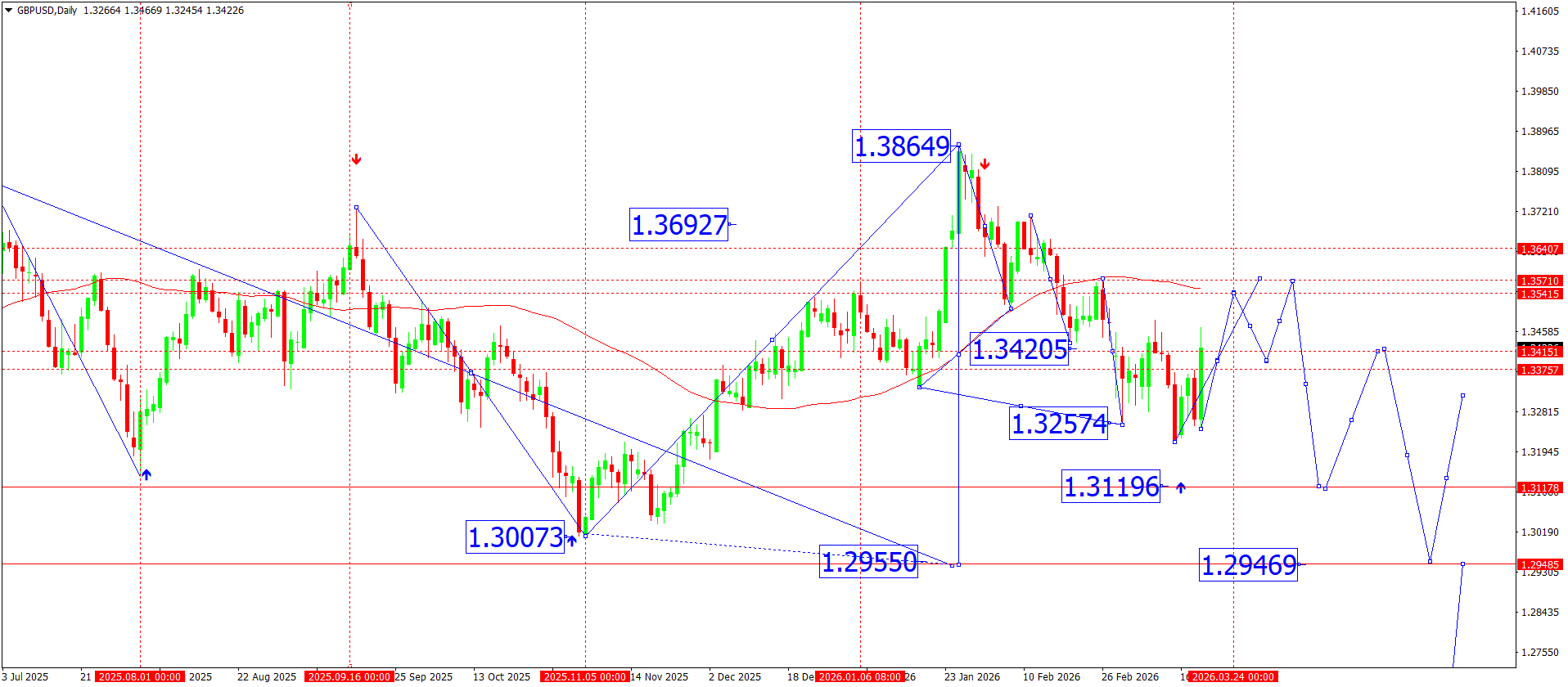 On the daily GBPUSD chart, the market completed the formation of an upward wave structure with a peak near 1.3864. After reaching that level, a downward wave phase began, which gradually transformed into downward momentum.