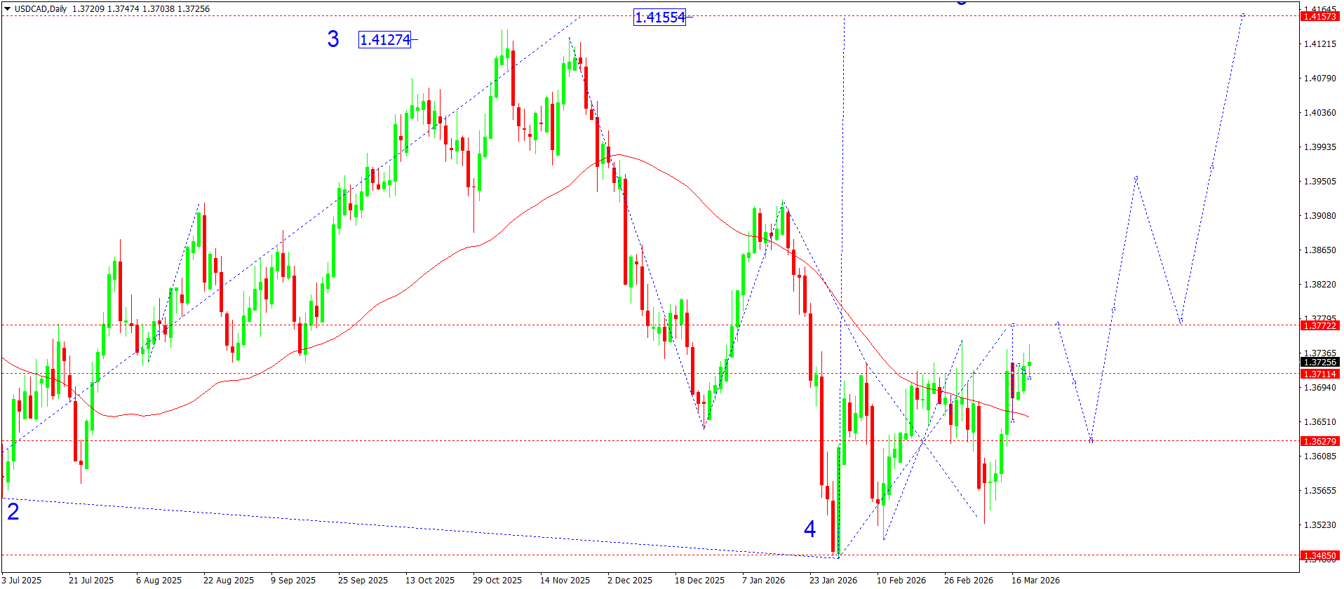 On the daily USDCAD chart, the market previously completed the formation of an upward wave structure with a peak near 1.4124, which corresponds to the top of the third higher-order wave. After that, quotes shifted to the formation of a corrective structure, which ended with a decline to the 1.3485 area, where wave 4 formed.