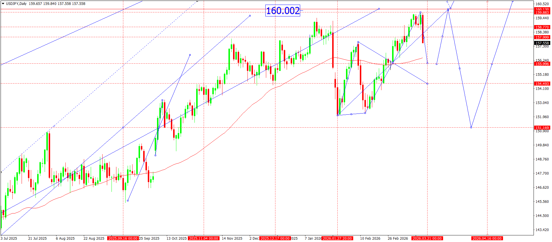 From a technical perspective, the daily USDJPY chart continues to show a firm uptrend. The price continues to move within an ascending channel that formed after the reversal from the 152.00 area. The last correction formed a local base, after which the market began to build a new growth structure. At the moment, the price is testing the interim resistance area around 159.80–160.00, where an important level aligned with previous highs is located.