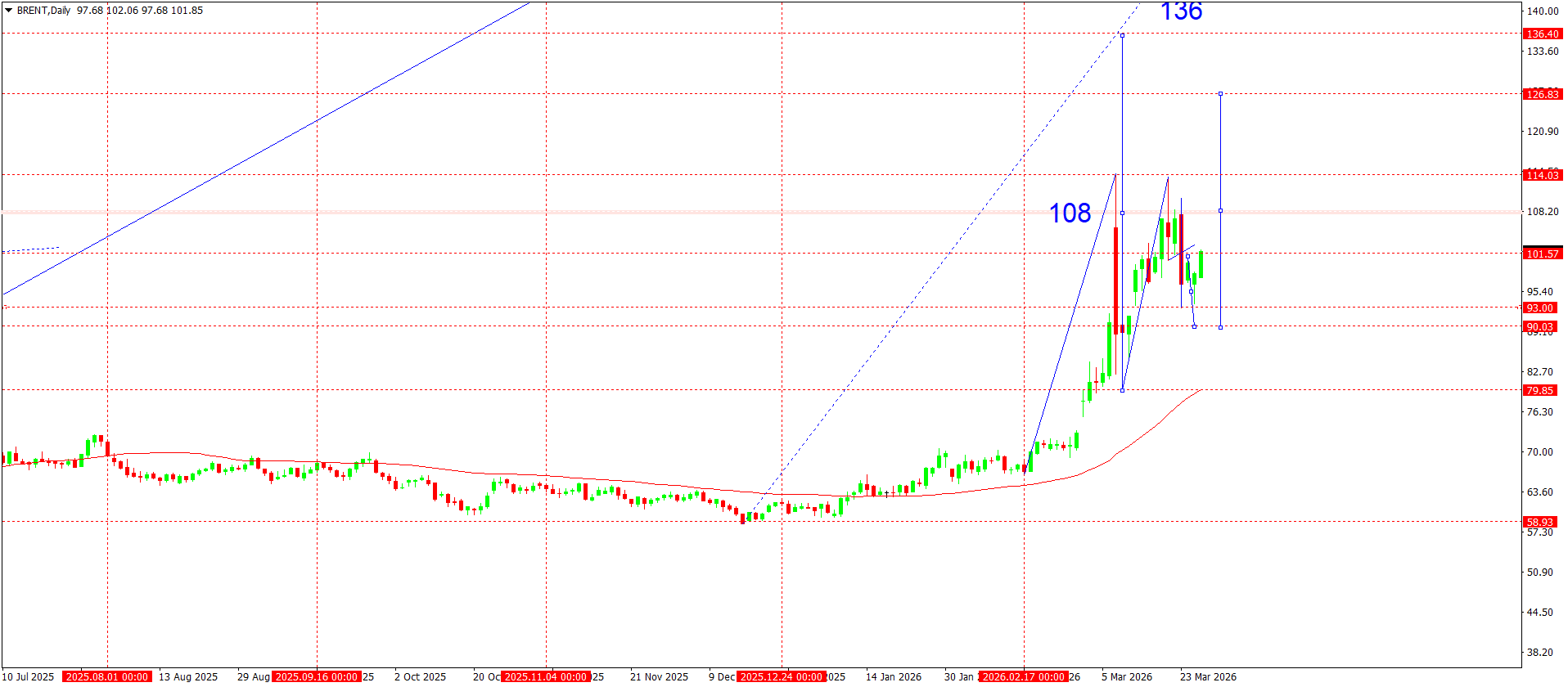 On the daily chart, Brent retains a clearly defined upward structure that formed after the completion of a prolonged consolidation period in the 58.93–70.00 range. The breakout above key resistance in the 79.85 area became the starting point for an accelerated impulsive rally, which later transitioned into an extended upward wave.