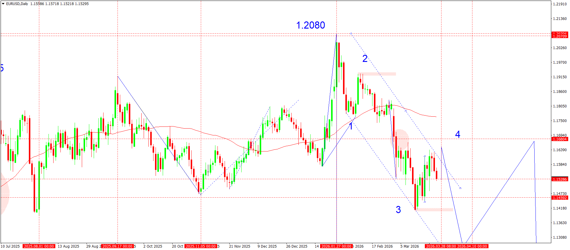 On the daily chart, the EURUSD pair maintains a downward structure after forming a local high in the 1.2080 area, which acts as the key peak of the current medium-term cycle. After completing the impulsive upward wave, the price shifted into a correction phase, forming a descending channel marked as the 2–3 structure.