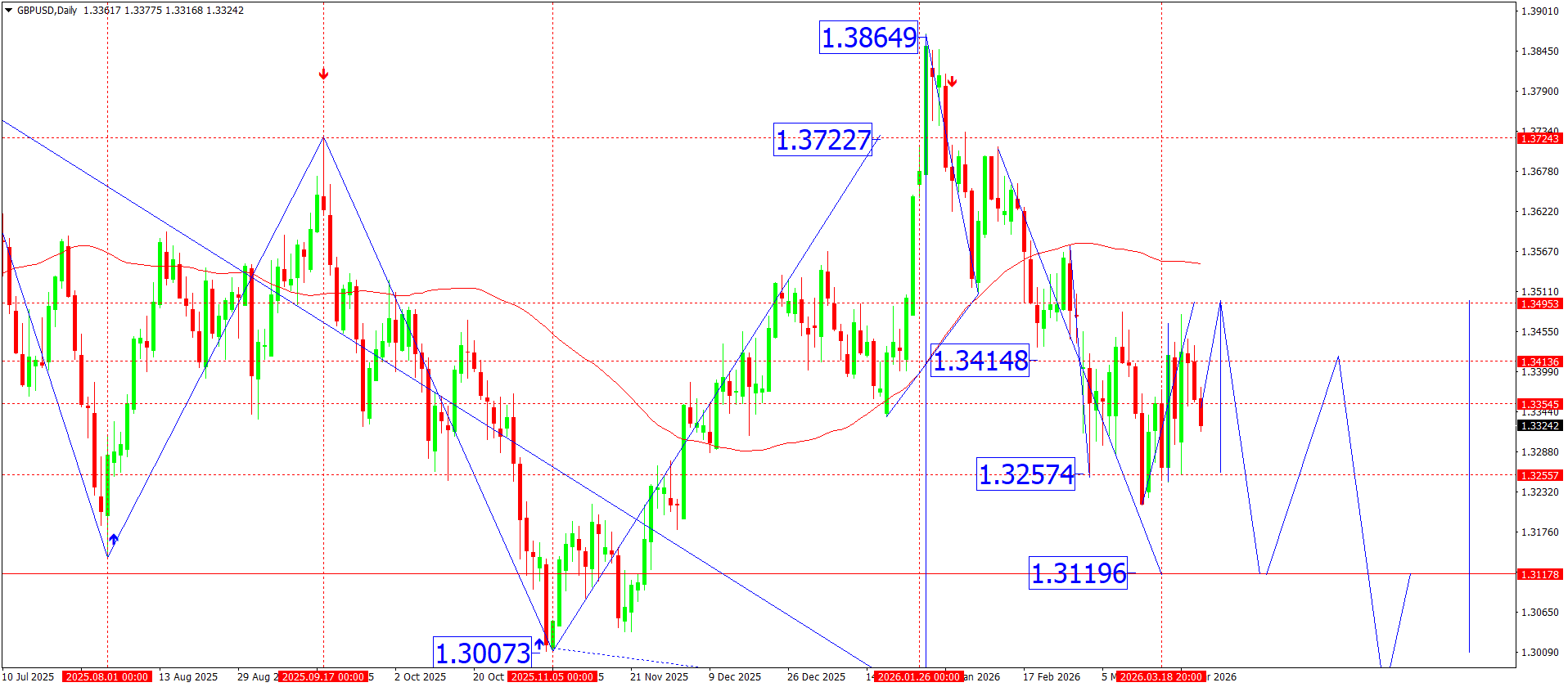 From a technical perspective, the daily GBPUSD chart is showing the formation of a downward structure after reaching a local high near 1.3864. After a sharp impulse lower, the price shifted into a correction phase, but the structure of highs and lows remains declining, indicating persistent selling pressure.