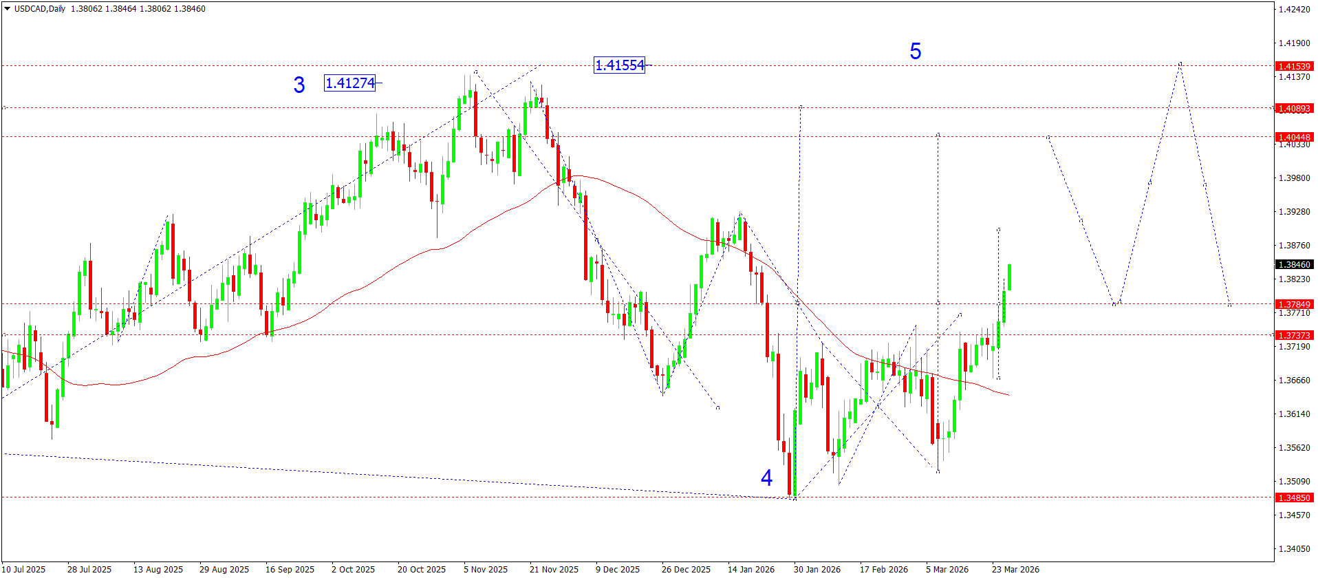 From a technical perspective, the USDCAD pair continues to form a recovery structure after completing its downward momentum from the November highs. The daily chart clearly shows the completion of a corrective wave in the 1.3485 area, from where the market formed a reversal structure, marked as potential wave 4.