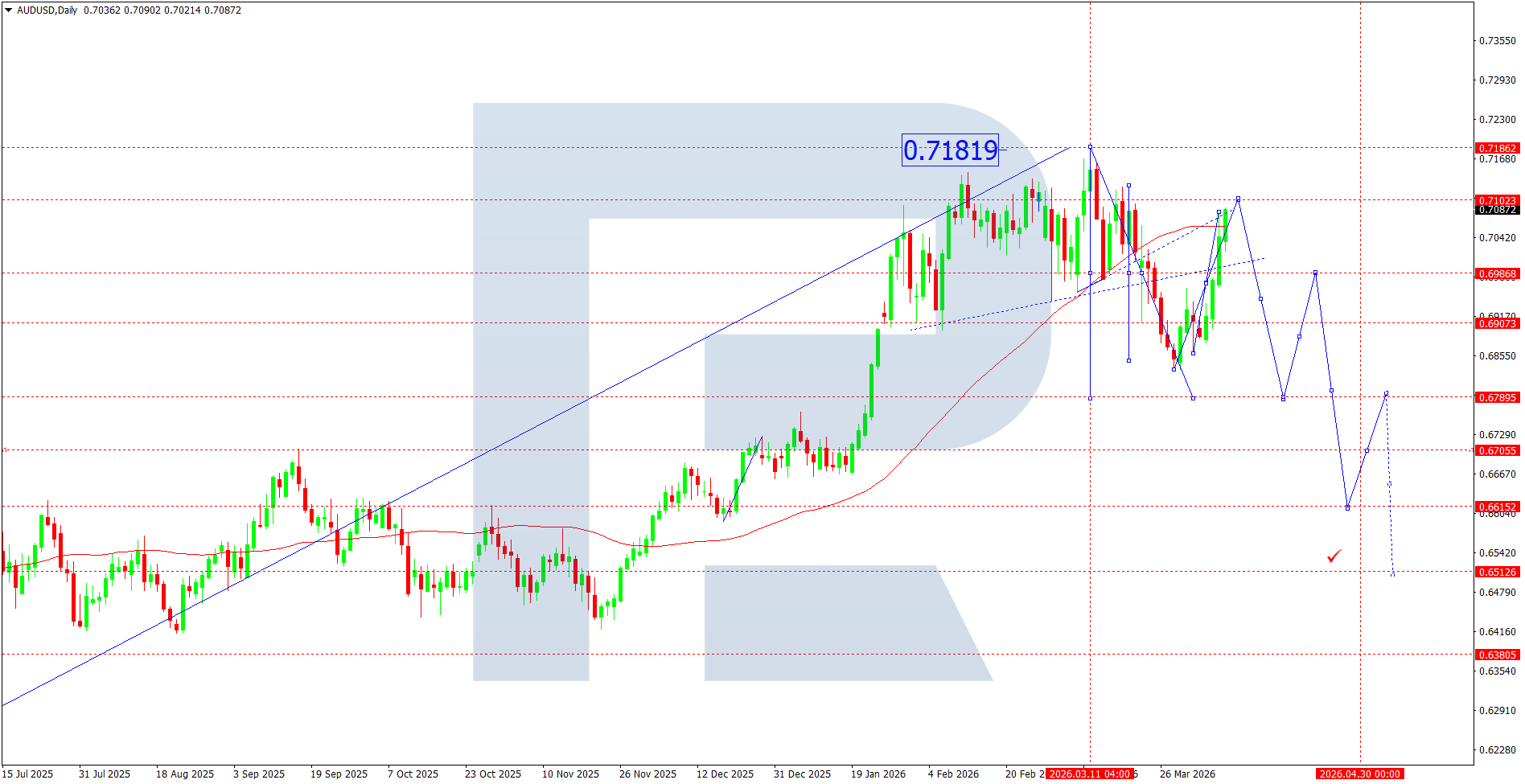 From a wave perspective, the structure shows completion of the upward phase and formation of a downward impulse with intermediate corrections. The 0.7102–0.7120 area acts as key resistance, from which price has repeatedly rebounded downwards. The moving average is also turning near current levels, reinforcing downside pressure.
