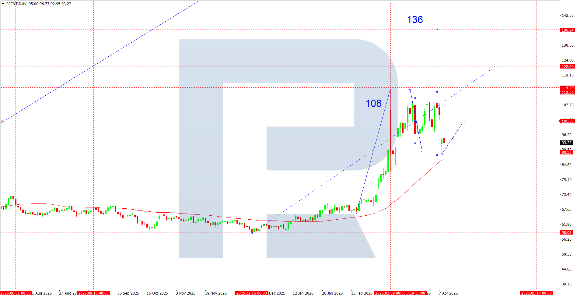 On the daily chart, Brent maintains an upward structure following a strong impulse from below 70.00 to highs near 108.00 and further towards the 136.00 extreme, which acts as a key medium-term target and reference point. After forming the peak, the market shifted into a phase of correction and consolidation.