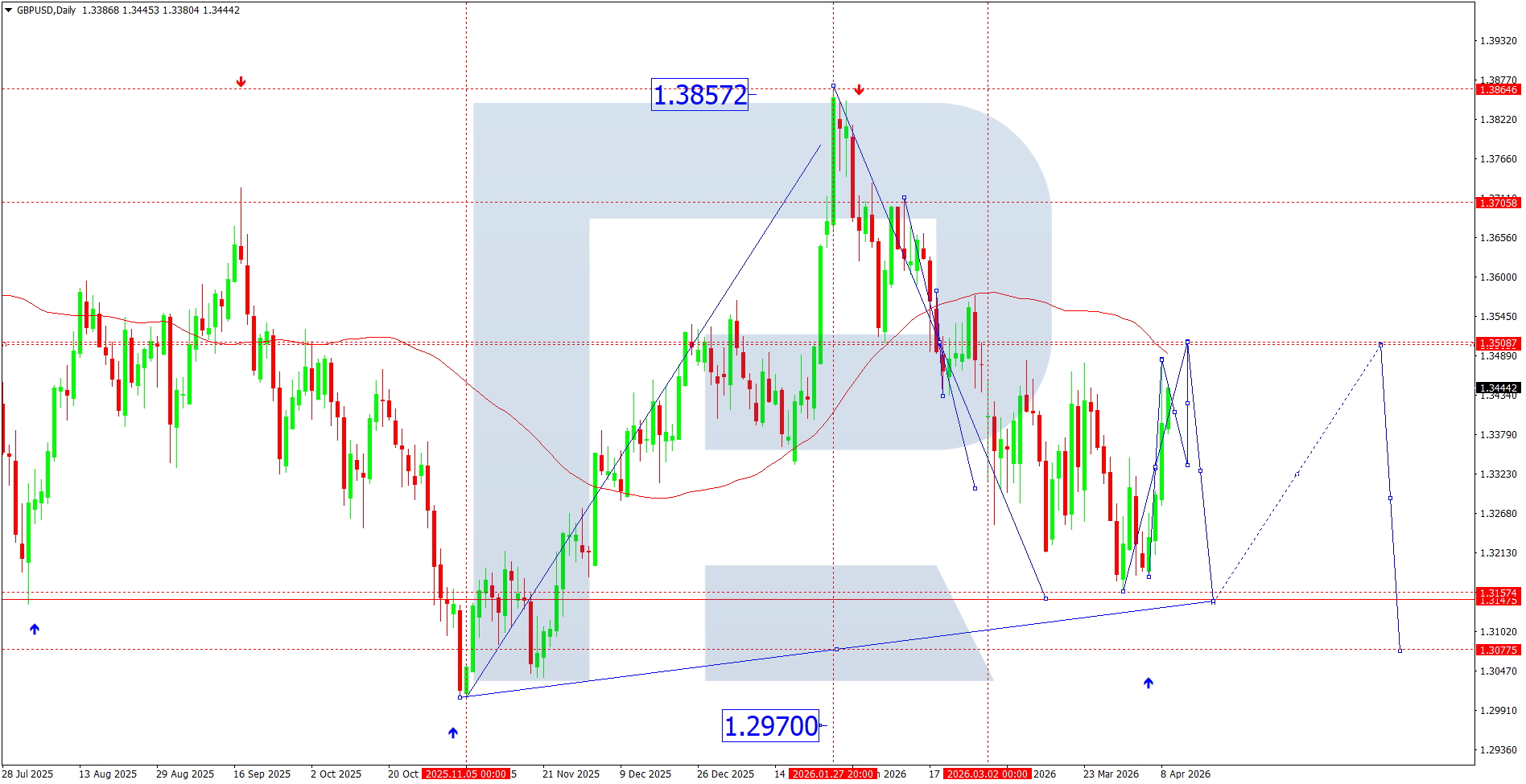 From a technical perspective, GBPUSD completed an upward corrective structure with a high near 1.3857 and then transitioned into a downward impulse phase. The formation of lower highs indicates the development of a downtrend. The current structure resembles a corrective pattern with a local range between 1.3157 and 1.3508.