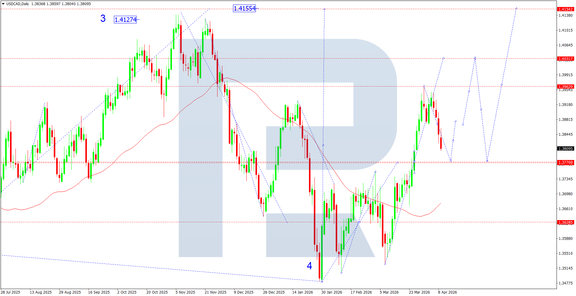 From a technical perspective, the daily chart shows a medium-term downtrend structure after forming a peak near 1.4155. The impulsive decline completed near 1.3477, where wave 4 formed, followed by a recovery. The current structure indicates the development of an upward corrective phase, although price has approached the 1.3962–1.4031 resistance zone, where growth is slowing.