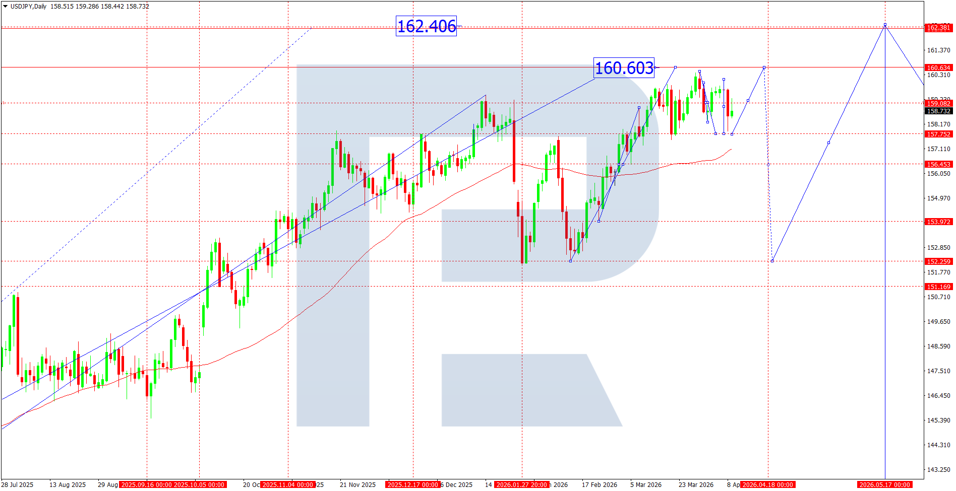 During the past week, USDJPY continued trading near local highs, reflecting sustained demand for the US dollar amid persistent hawkish rhetoric from the US Federal Reserve (Fed). Recent US macroeconomic data indicate economic resilience: inflation remains above target levels, while the labour market shows stability. This reduces the likelihood of a near-term shift towards policy easing by the Fed. At the same time, the Bank of Japan (BoJ) continues to maintain a loose monetary policy stance despite some signals of rising domestic inflationary pressure. The interest rate differential remains a key driver supporting USD strength against the yen. Additional pressure on the yen comes from weak domestic demand and the regulator’s cautious stance on further tightening.