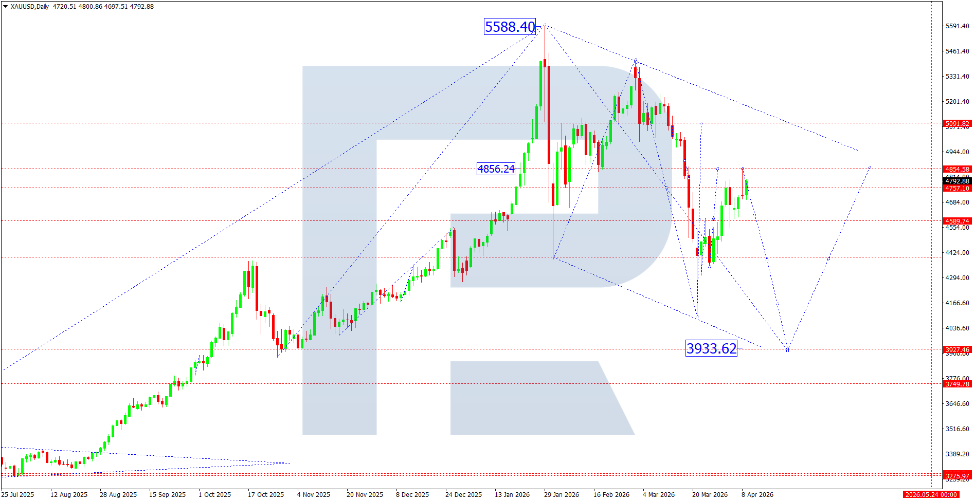 From a technical perspective, the daily chart shows a corrective downward structure after the peak near 5,588. Price completed a downward impulse followed by a wave correction, with the current consolidation developing within the 4,589–4,854 range. A rebound from 3,933 formed a local upward impulse, but it remains corrective within a broader downward structure.