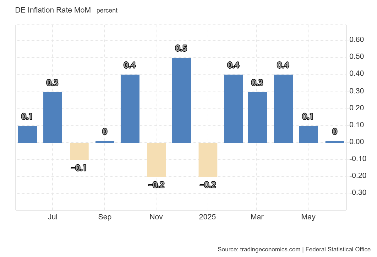 Germany's Consumer Price Index (CPI) came in at 0.0% for June, in line with forecasts and slightly below the previous reading of 0.1%. This indicates stabilisation in inflationary pressures on consumer prices. A flat CPI figure reduces the risk of aggressive monetary tightening by the European Central Bank, thereby supporting corporate stability, especially in sectors heavily reliant on consumer demand such as retail, automotive, and durable goods manufacturing.