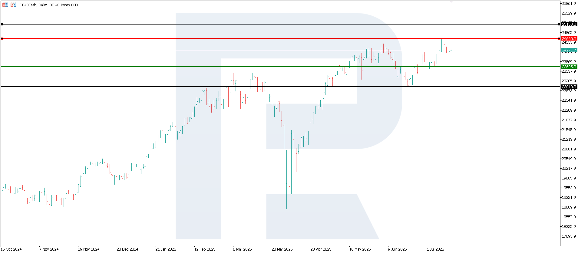 Stable CPI figures in Germany create favourable conditions for medium-term growth in the DE 40 index, minimising risks of sudden disruptions in key sectors. The DE 40 continues its upward movement with an eye on a new all-time high. The next upside target is 25,150.0, which would mark a record level.