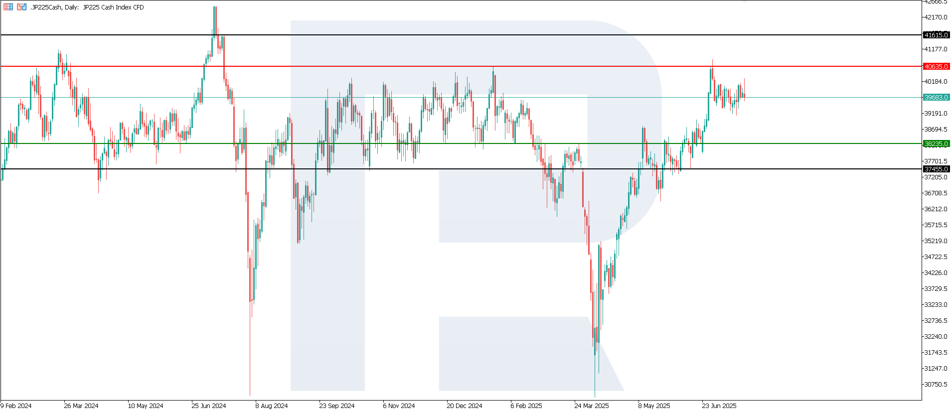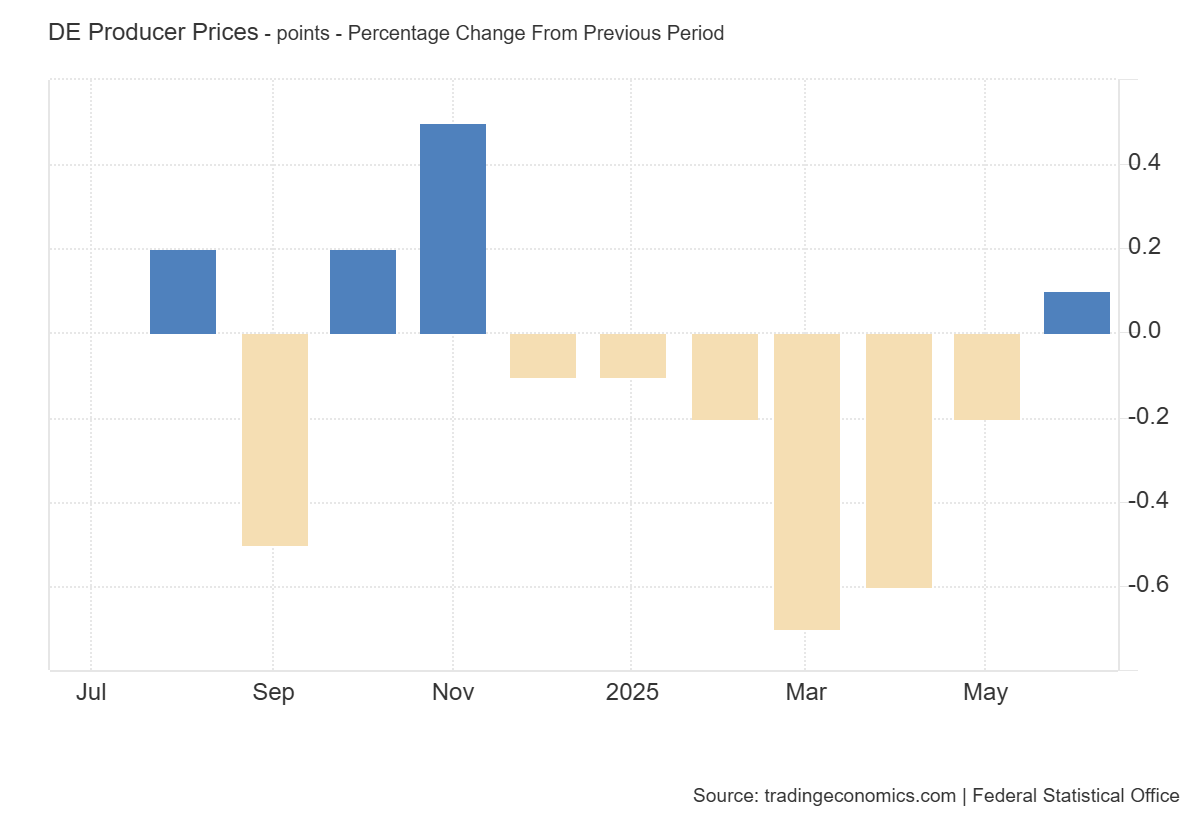 Germany’s PPI for June 2025 showed a 0.1% increase, matching forecasts and improving from the previous month’s -0.2%. A moderate rise in producer prices indicates stability in the manufacturing sector and the absence of sharp price surges, which reduces risks for corporate profitability within the index. This supports investor confidence in sectors such as industrials, engineering, and chemicals, as their cost base is not significantly affected by inflationary shocks.