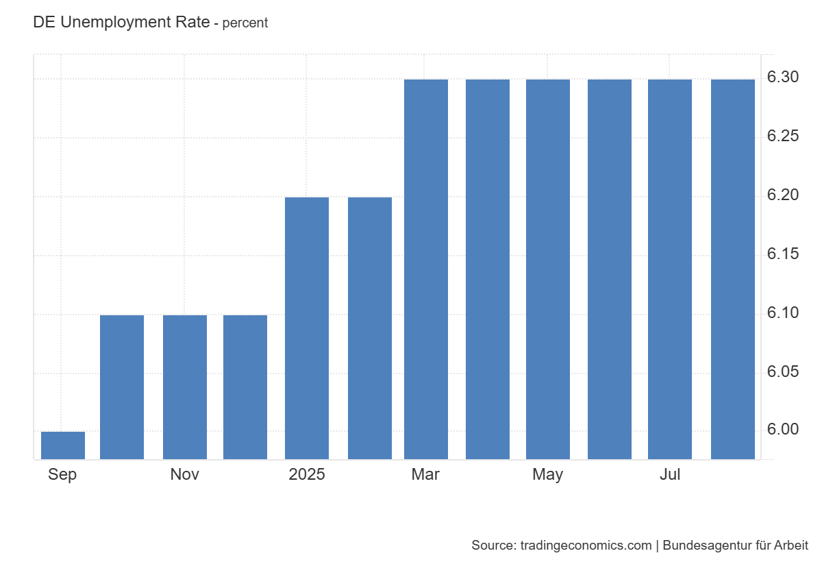 Germany’s unemployment rate for August 2025 came in at 6.3%, in line with both forecasts and the previous reading. The stability of the indicator confirms that the German labour market remains resilient despite internal and external economic challenges. For the German stock market, this stability is highly significant. A steady unemployment rate points to sustained household demand, which underpins domestic consumption.