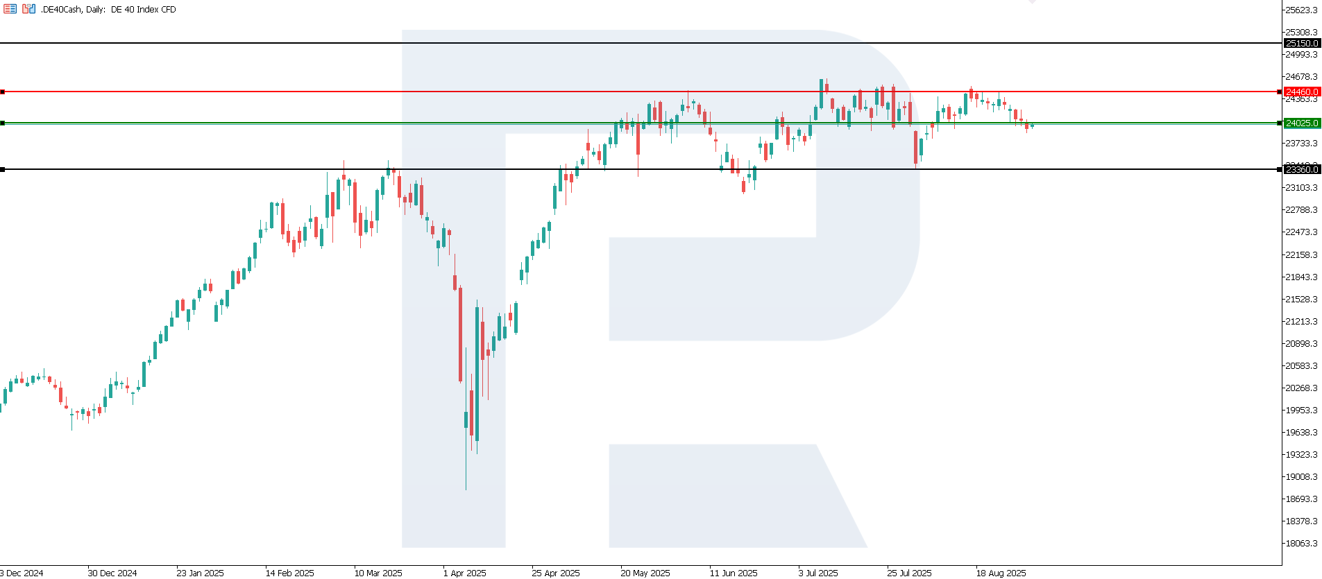 Germany unemployment rate: https://tradingeconomics.com/germany/unemployment-rateThe DE 40 index has formed a resistance level at 24,460.0, with a support level yet to form after a breakout below 24,025.0. The asset sees heightened volatility, with frequent shifts in the broader trend. The downtrend will prevail in the short term.