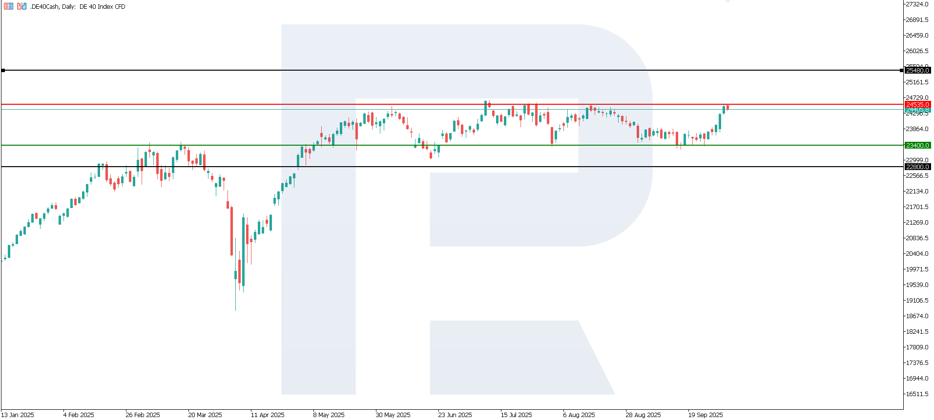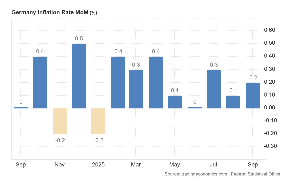 Germany’s Consumer Price Index (CPI) increased by 0.2% month-on-month in September 2025, matching the forecast of 0.2% and slightly above the previous reading of 0.1%. The reading in line with expectations indicates stable inflationary pressure. For investors, this means no new signals to change expectations regarding the European Central Bank’s monetary policy. Since price growth remains moderate, the likelihood of a sharp policy tightening remains low, which is perceived as a moderately positive factor for the stock market. However, a slight acceleration compared to the previous month could prompt caution among market participants, especially if signs of broader price increases emerge.
