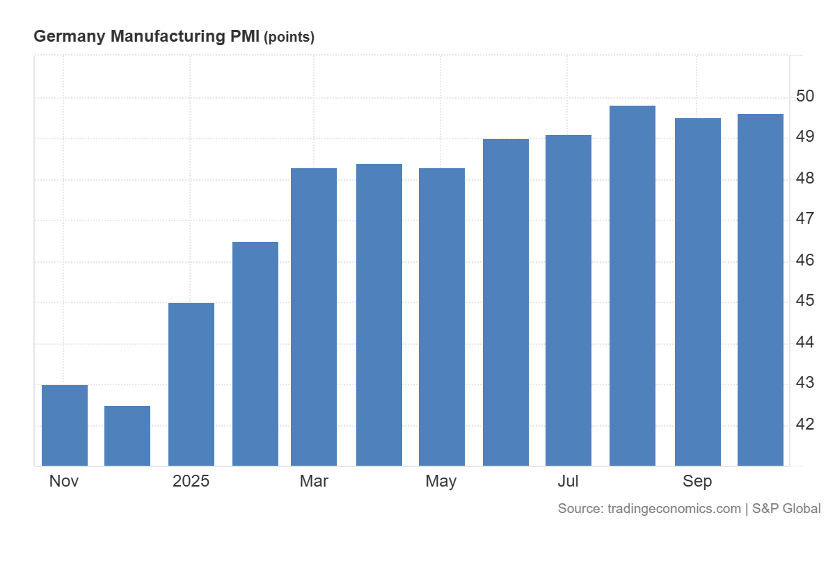 Germany’s manufacturing PMI for October came in at 49.6 points, slightly above both the consensus forecast of 49.5 and the previous reading of 49.5. The figure indicates that the industrial sector remains in contraction, but with signs of gradual stabilisation near the neutral threshold. For the equity market, this is a moderately positive signal in terms of expectations: the slower pace of decline in manufacturing supports the valuation of future cash flows in cyclical sectors, reduces the risk of margin erosion from underutilised capacity, and may help narrow discounts on industrial assets. However, since the indicator remains below 50, it continues to reflect weakness in domestic and external demand, limiting the upside potential and making it dependent on confirmation of improvement in subsequent data releases.
