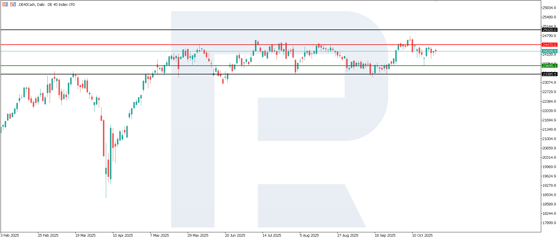 The PMI reading below 50 will continue to limit revaluation potential: the market is likely to remain selective, favouring issuers with strong operational efficiency, diversified export portfolios, and solid order backlogs, while companies dependent on domestic capital demand may underperform. The next downside target for the DE 40 index could be at 23,385.0.