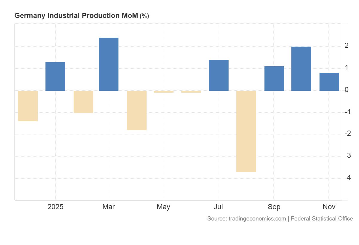 Germany’s industrial production indicator came out at 0.8% month-on-month, significantly better than expectations of a 0.6% decline. For the equity market, this represents a clear growth surprise, which reduces the risk of a sharp economic slowdown in the coming months and improves short-term expectations for revenue and margins among cycle-sensitive companies. Such a release typically supports risk appetite and increases investors’ willingness to buy industrial and export-oriented stocks.