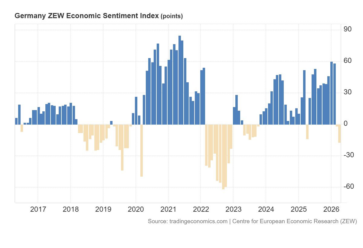 The drop in Germany’s ZEW Economic Sentiment Index to −17.2, below the forecast of −5.9 and the previous reading of −0.5, is a negative signal for the DE 40 index. The data suggests a significant deterioration in expectations among investors and analysts regarding the outlook for the German economy. For the market, this means participants are increasingly pricing in weaker business activity, potential pressure on corporate earnings, and more cautious investment demand.